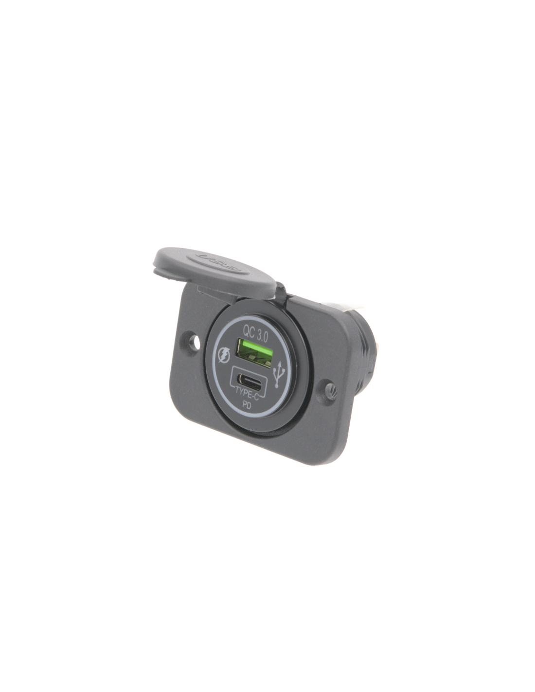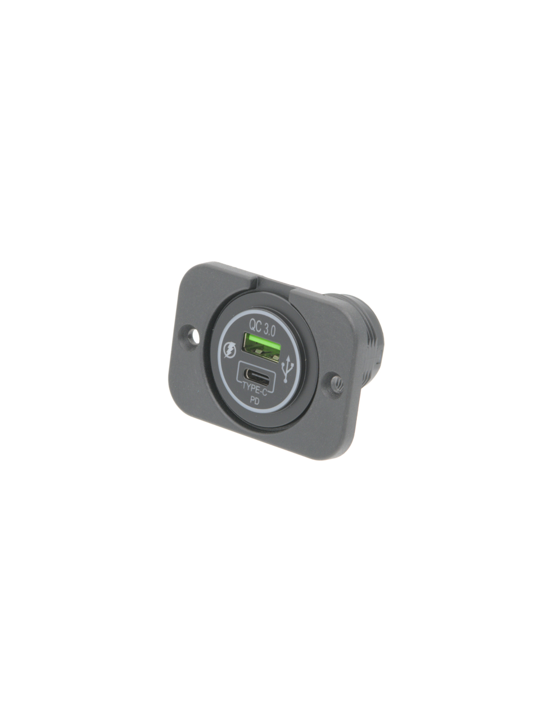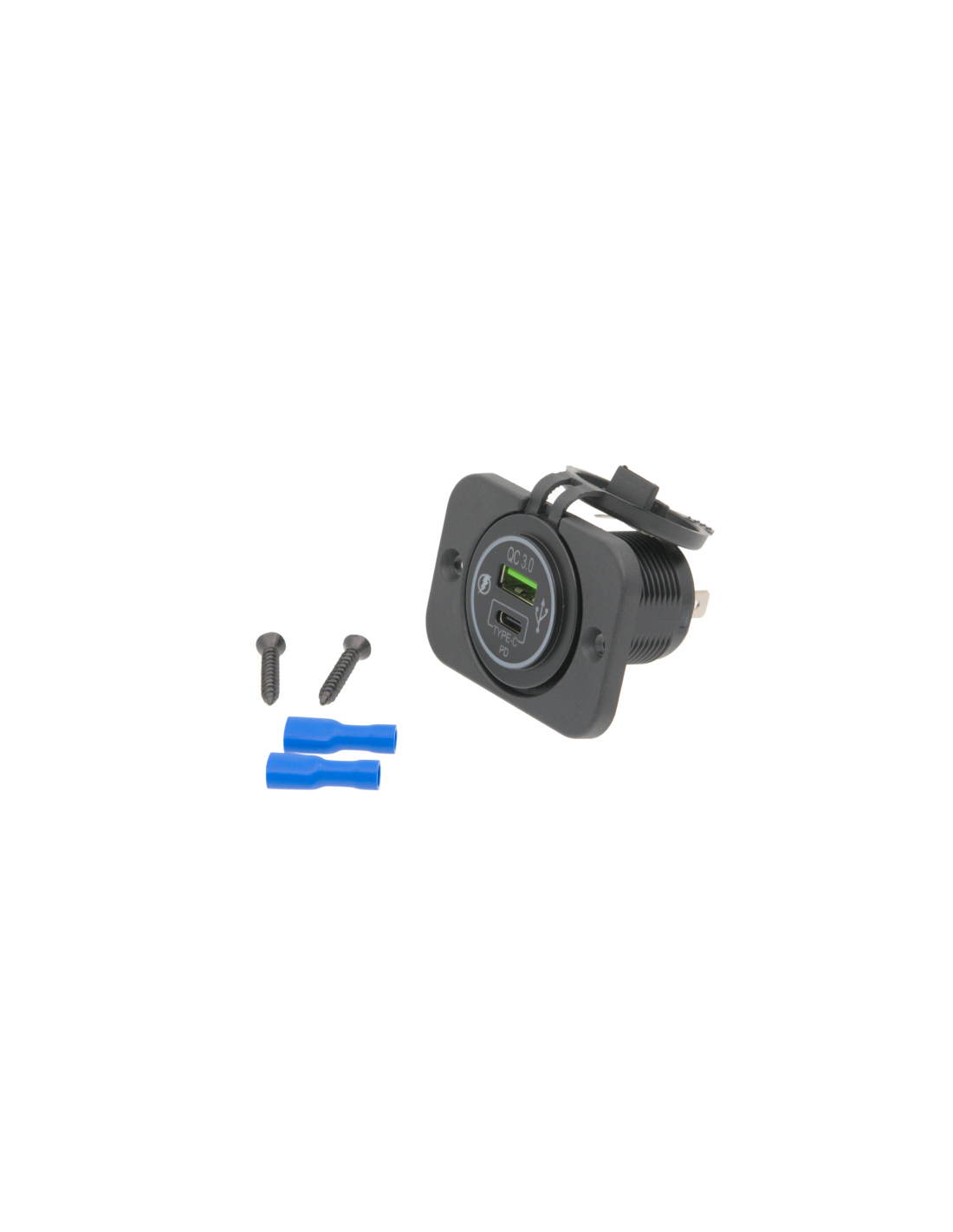 Base de alimentación para fijar a panel mediante roscado o atornillado, con conexión de alimentación mediante faston de 6.35 mm. Compatible con voltajes de alimentación DC 12V. Caracteristicas: - Potencia total: 36W - Voltaje de entrada: 12V - Voltaje de salida: 5V/3A, 9V/2A, 12V/1.5A - Referencia IP: IP65 Incluye panel de montaje, tapón antiagua, tornillos y faston para cables de 1.5-2.5 mm.