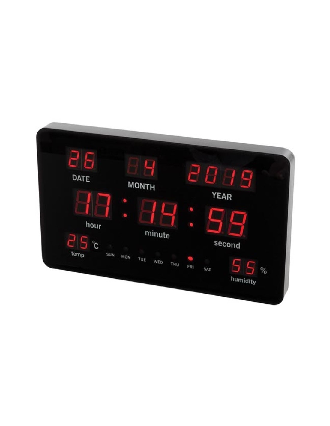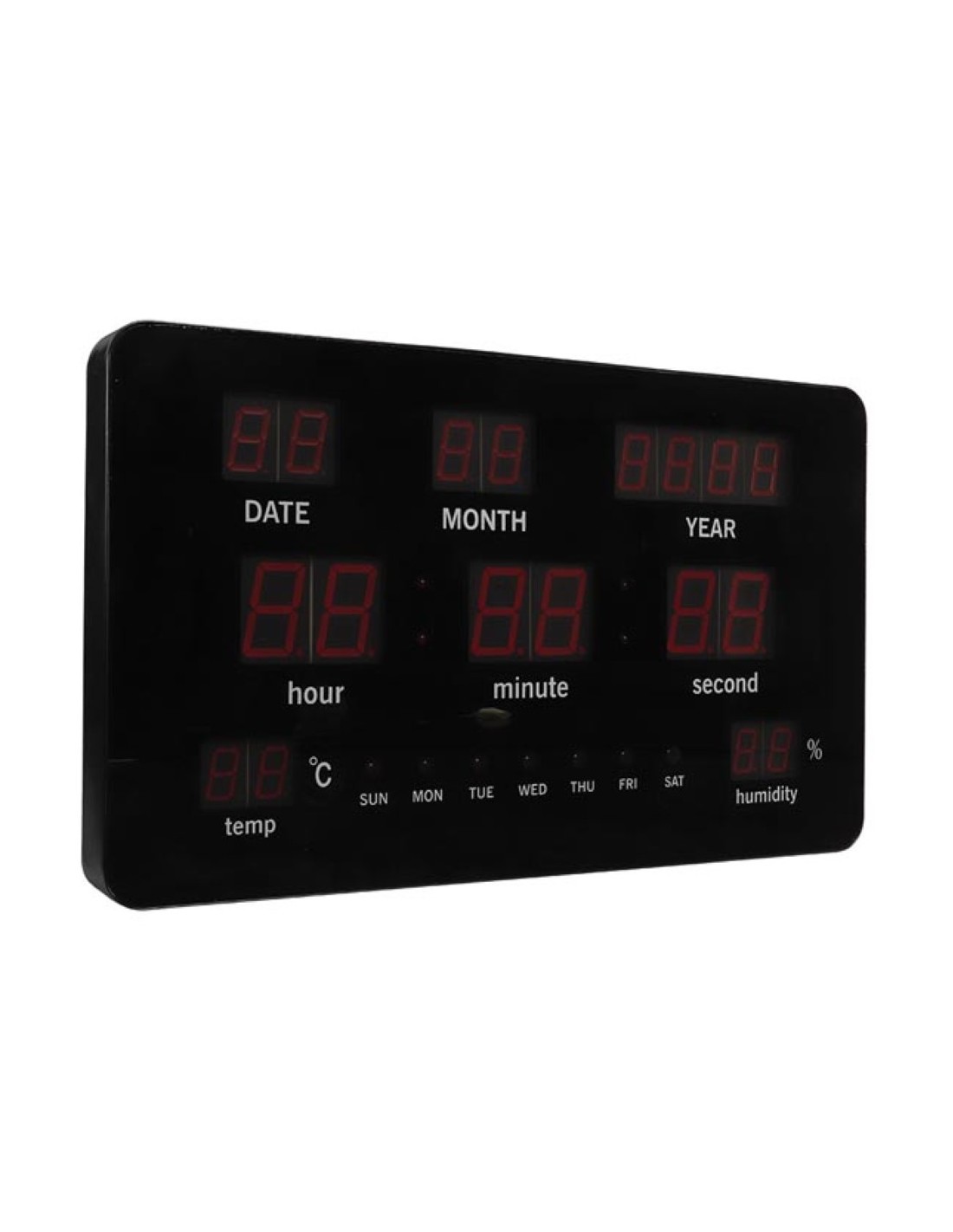Este reloj moderno en formato de 24 horas tiene una caja negra y una gran pantalla digital que muestra la fecha, la hora, la temperatura y la humedad. Con la gran pantalla digital con LED rojo, el tiempo es claramente legible a la luz del sol y en la oscuridad. El reloj encontrará su lugar no solo en su oficina, cocina o comedor, sino también en la oficina, entrada, sala de espera o clase de clase. Gracias al sistema de fijación central y universal, el reloj se puede instalar en cualquier lugar. El reloj funciona en la red eléctrica (adaptador incluido). Batería de emergencia: la batería de emergencia le permite mantenerEn memoria, la fecha y la hora en caso de falla de energía.