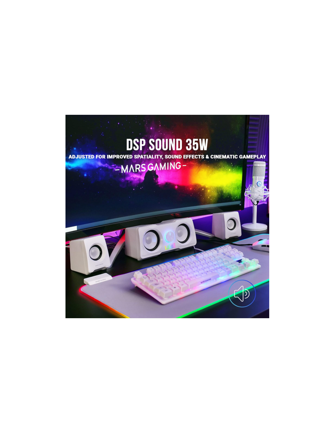 Los altavoces gaming MS22 con alimentación USB y entrada de audio jack 3.5, cuentan con una iluminación RGB Flow dinámica en la parte frontal que le dará un aspecto único a tu setup up. Utilízalos con tus dispositivos favoritos y disfruta de una calidad y potencia de sonido inigualables gracias a su potente sonido DSP de 35W y sus 4 altavoces activos. Controla el volumen fácilmente desde la rueda de control frontal.