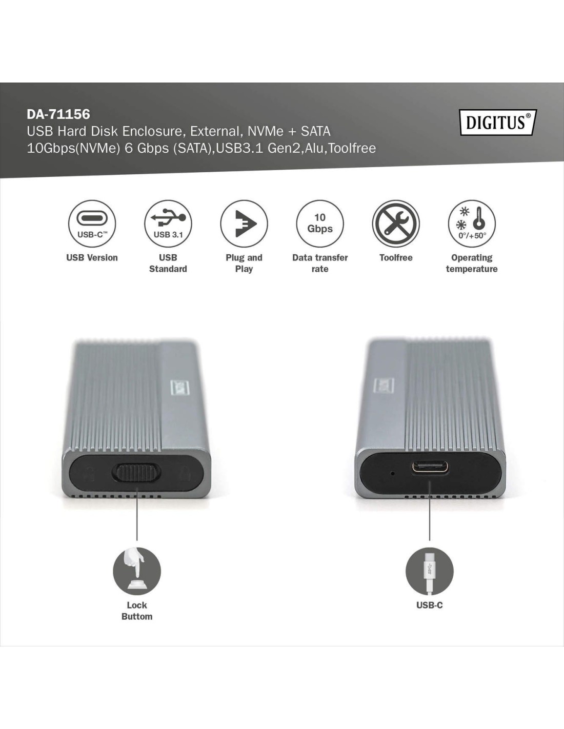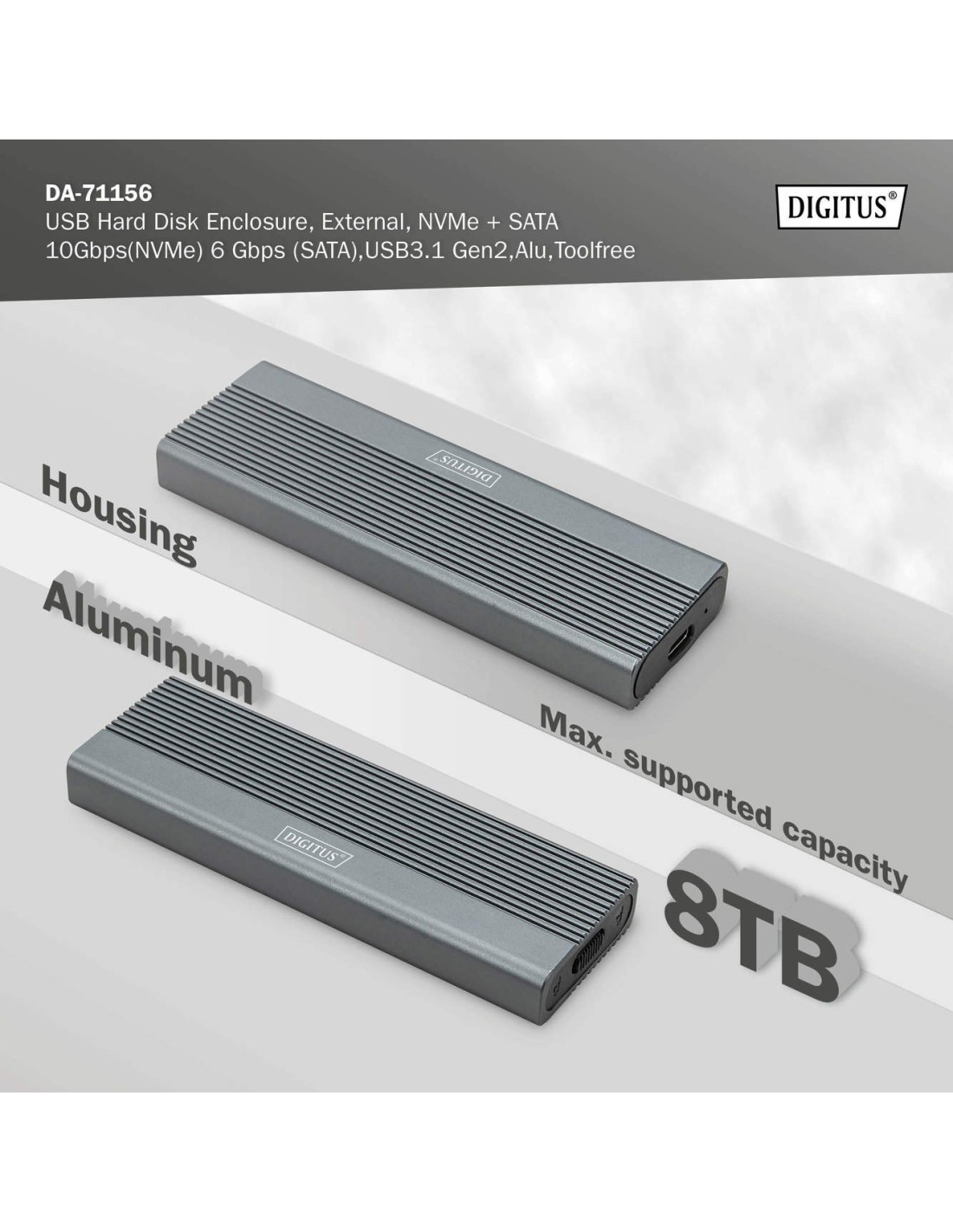 La caja para disco duro USB ofrece una solución de almacenamiento versátil y potente para unidades SSD NVMe y SATA. Con soporte para módulos M.2 en los formatos 2230, 2242, 2260 y 2280 y una capacidad máxima de almacenamiento de hasta 8 TB, es compatible con una amplia gama de SSD. La velocidad de transferencia de datos es de 10 Gbps para NVMe y 6 Gbps para SATA, mientras que la interfaz USB 3.1 Gen2 es retrocompatible con USB 3.1, 3.0, 2.0 y 1.1. El diseño sin herramientas permite una instalación sencilla y el robusto chipset JMS581DL garantiza un rendimiento fiable y eficiente. Un indicador LED integrado facilita la supervisión del estado de la SSD, y la duradera carcasa de aluminio Pantone 430C proporciona una excelente disipación pasiva del calor. Con unas dimensiones compactas de 101x32x10 mm y un peso de sólo 97 g, la carcasa es ideal para uso móvil. Admite plug-and-play y se alimenta directamente a través del puerto USB. La carcasa es compatible con Windows (11, 10, 8, 7, XP, 2000), macOS, Linux (2.4.x o superior), Google Chrome OS (9.x o superior), Android e iOS y ofrece compatibilidad integral con productos USB-C.
