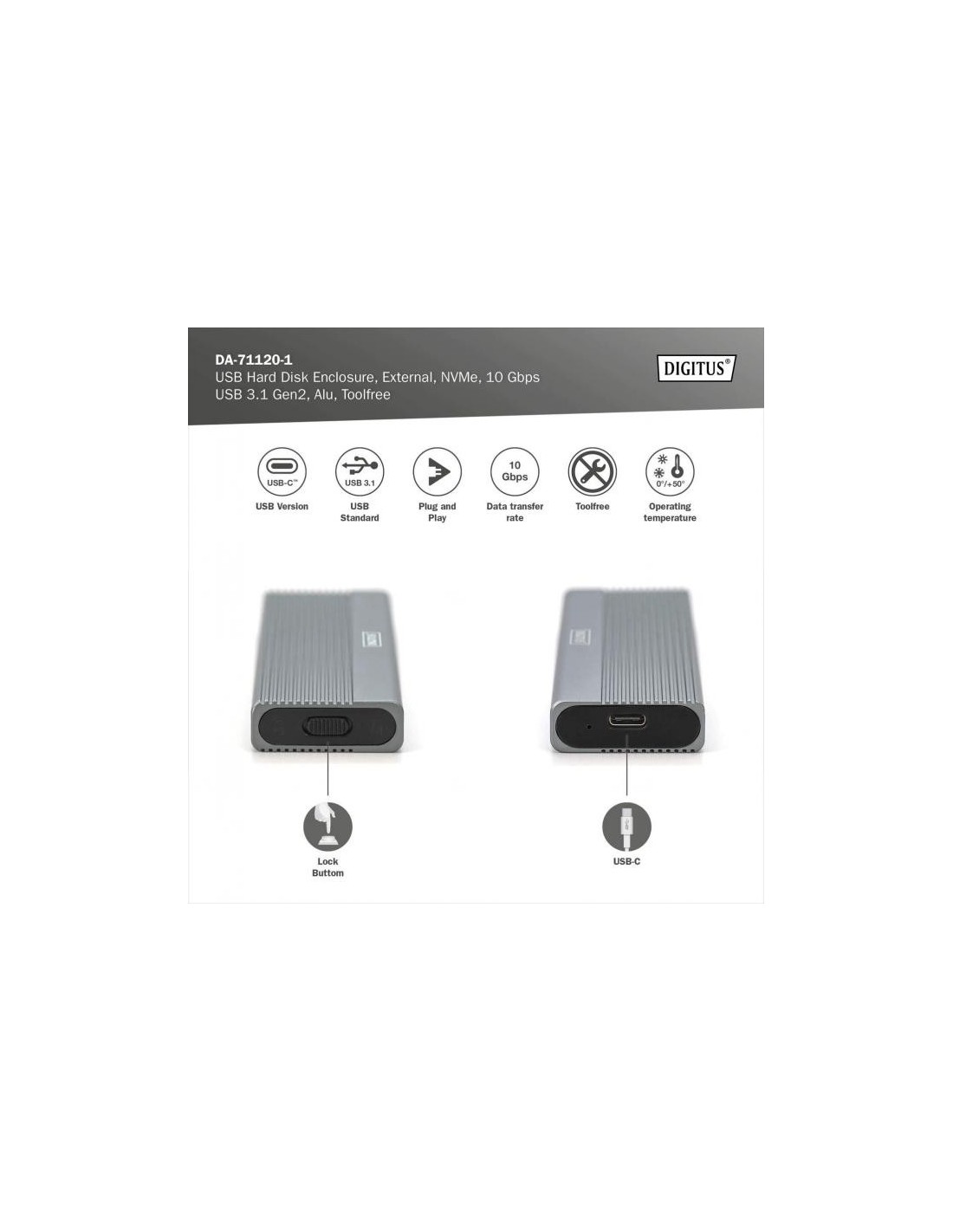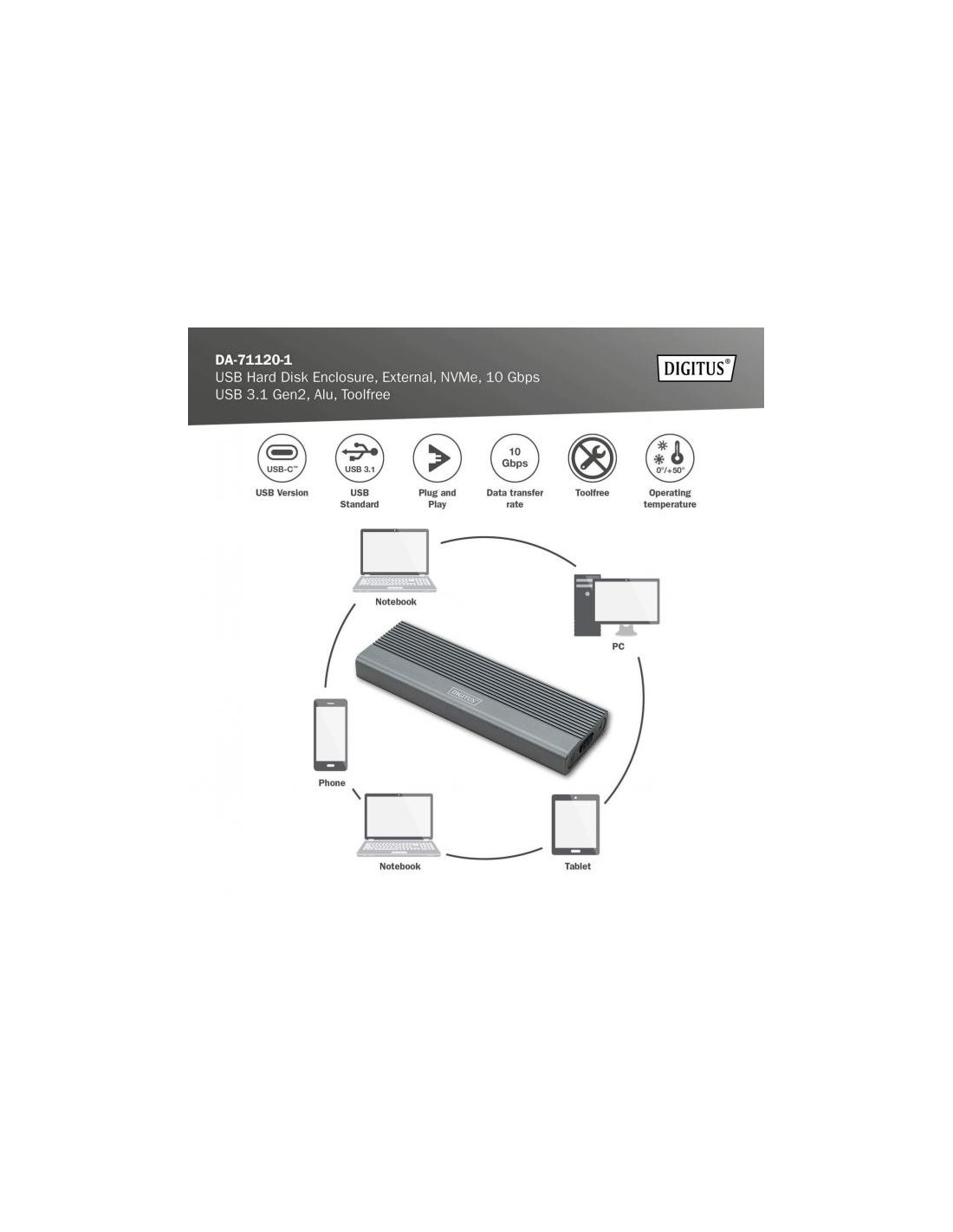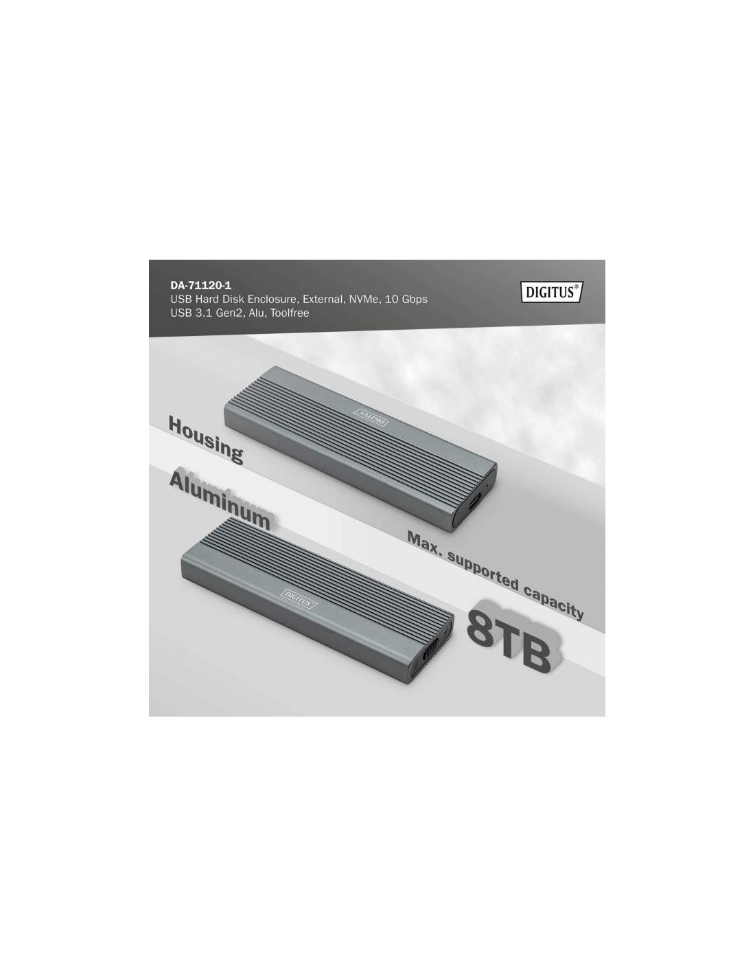 La caja para SSD M.2 NVMe DA-71120-1 ofrece una solución de almacenamiento potente y versátil para todas sus necesidades de datos. Admite módulos M.2 en formatos 2230, 2242, 2260 y 2280 y es compatible con una amplia gama de SSD. Con una capacidad de hasta 8 TB, ofrece espacio suficiente para todos sus archivos y datos. Gracias a la rápida velocidad de transferencia de datos de 10 Gbps y a la interfaz USB 3.1 Gen 2, compatible con USB 3.1, 3.0, 2.0 y 1.1, podrá disfrutar de transferencias de archivos rápidas y un rendimiento fluido. El diseño plug-and-play permite una instalación sencilla sin ajustes complicados. El robusto chipset JMS583 garantiza un rendimiento NVMe fiable y eficiente, mientras que el indicador LED integrado permite controlar fácilmente el estado de la SSD. La duradera y elegante carcasa de aluminio en Pantone 430C ofrece una excelente disipación pasiva del calor. Con unas dimensiones compactas de 101x32x10 mm y un peso de solo 97 g, la carcasa es ideal para uso móvil y compatible con Windows, macOS, Linux, Google Chrome OS, Android e iOS.