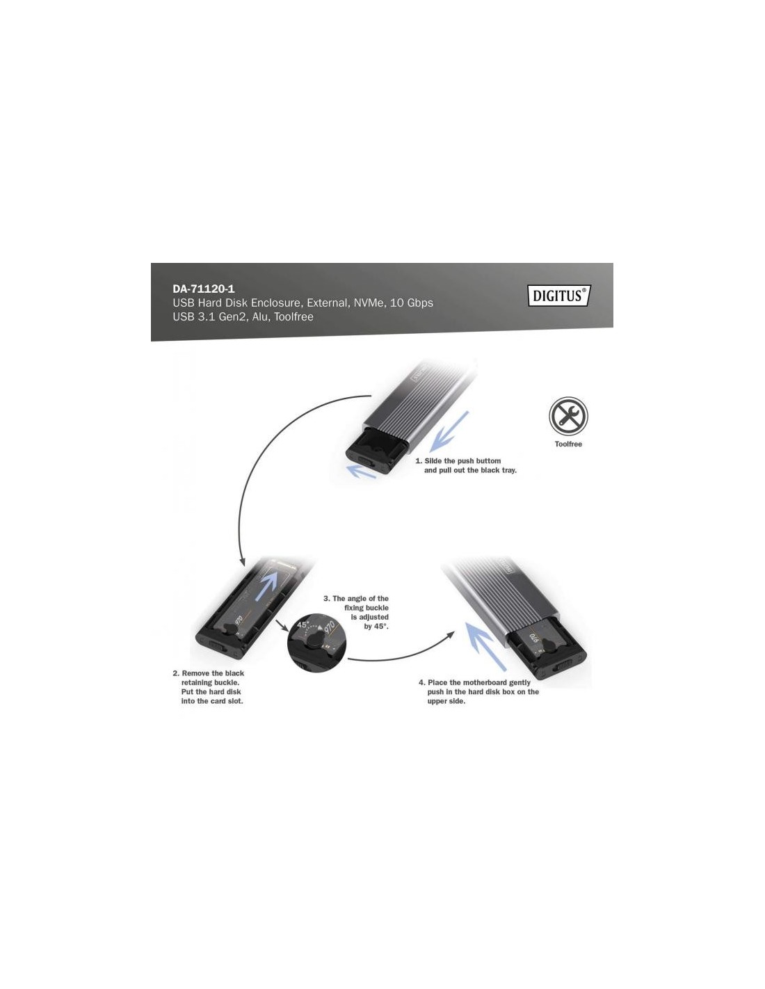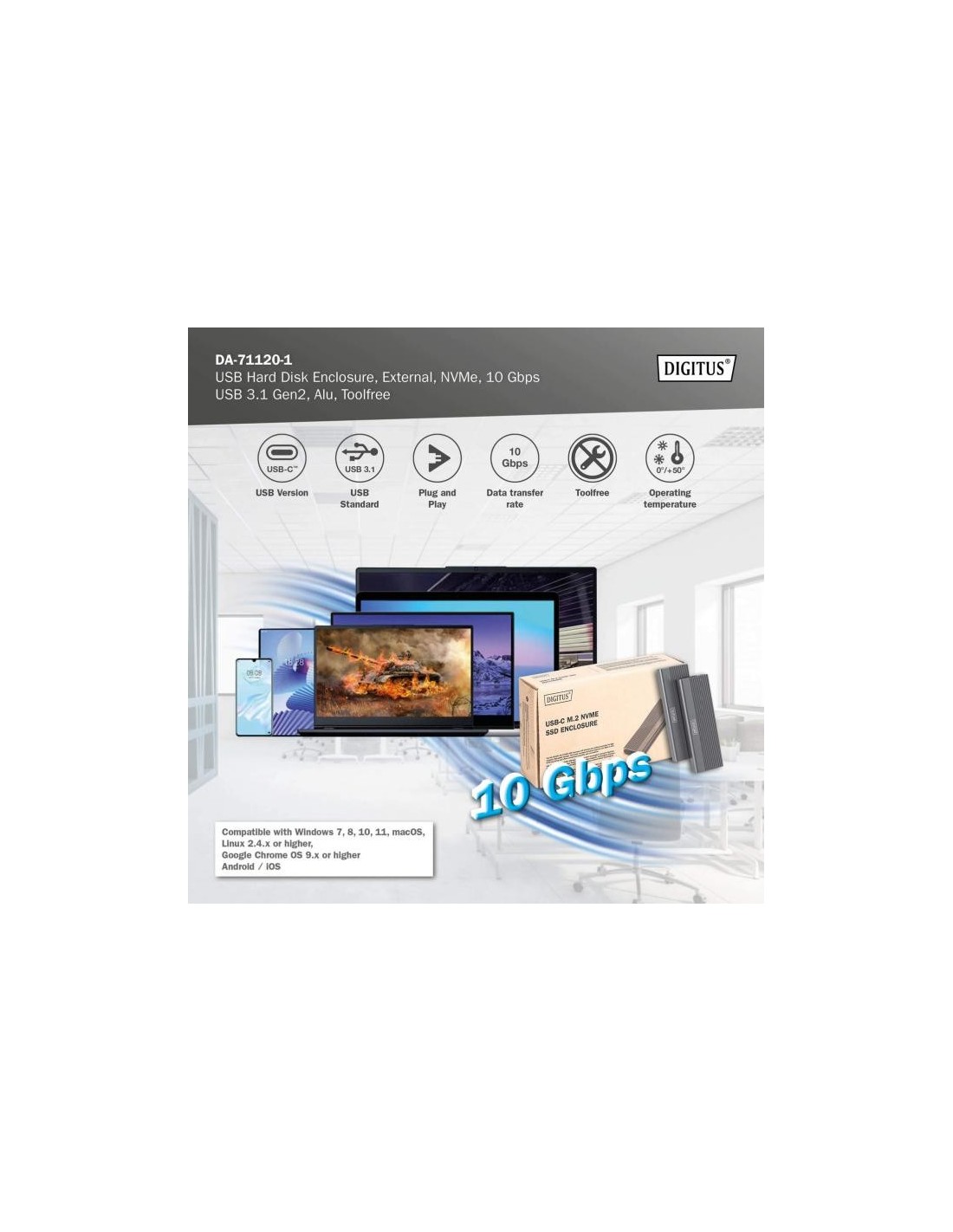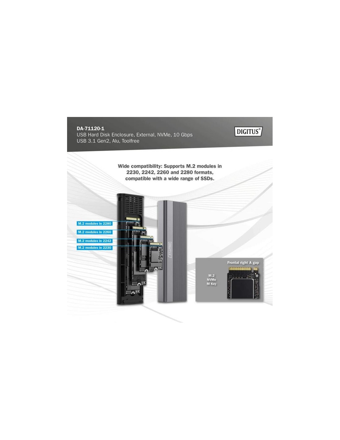 La caja para SSD M.2 NVMe DA-71120-1 ofrece una solución de almacenamiento potente y versátil para todas sus necesidades de datos. Admite módulos M.2 en formatos 2230, 2242, 2260 y 2280 y es compatible con una amplia gama de SSD. Con una capacidad de hasta 8 TB, ofrece espacio suficiente para todos sus archivos y datos. Gracias a la rápida velocidad de transferencia de datos de 10 Gbps y a la interfaz USB 3.1 Gen 2, compatible con USB 3.1, 3.0, 2.0 y 1.1, podrá disfrutar de transferencias de archivos rápidas y un rendimiento fluido. El diseño plug-and-play permite una instalación sencilla sin ajustes complicados. El robusto chipset JMS583 garantiza un rendimiento NVMe fiable y eficiente, mientras que el indicador LED integrado permite controlar fácilmente el estado de la SSD. La duradera y elegante carcasa de aluminio en Pantone 430C ofrece una excelente disipación pasiva del calor. Con unas dimensiones compactas de 101x32x10 mm y un peso de solo 97 g, la carcasa es ideal para uso móvil y compatible con Windows, macOS, Linux, Google Chrome OS, Android e iOS.