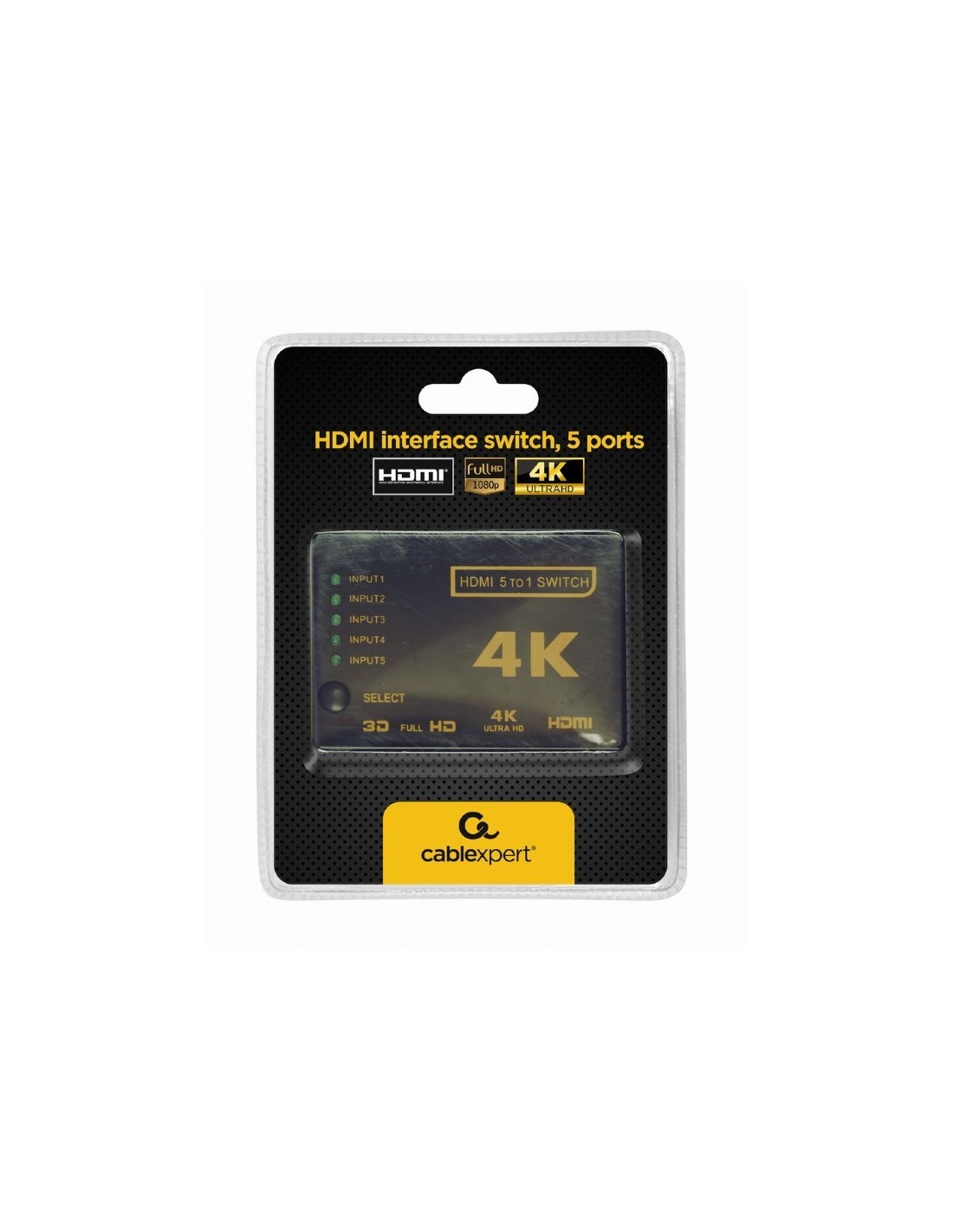 Puertos: 5 puertos de entrada, 1 puerto HDMI de salida Estándar de interfaz: HDMI + HDCP v.1.4a compatible con versiones anteriores 1.0/1.1/1.2/1.2a/1.3/1.4, compatible con estándares CTS 1.4a, DVI 1.0 Formatos de vídeo: HDMI de 480i, 576i, 480p, 576p, 720p, 1080i, 1080p, 4K x 2K (3840 x 2160 a 24/25/30 Hz, 4096 x 2160 a 24 Hz) Distancia del cable de entrada: hasta 15 m Cable estándar HDMI AWG26 Distancia del cable de salida: hasta 25 m Cable estándar HDMI AWG26 Consumo de energía: 5 V CC hasta 0,15 A (autoalimentado desde HDMI) Dimensiones: 77 x 56 x 15 mm Peso neto: 0,4 kg