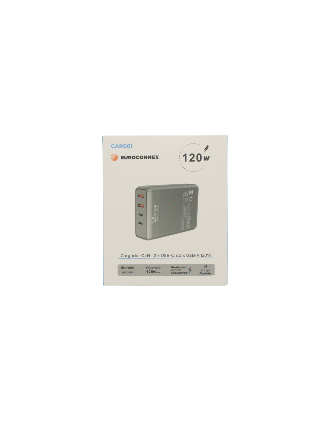 Cargador compacto y eficiente diseñado para entornos profesionales. Cuenta con 4 puertos: - 2 puertos USB-A: Salida de 5V/3A, 9V/2A, 12V/1.5A (hasta 15W combinados). - 2 puertos USB-C: Salida de 5V/3A, 9V/3A, 12V/3A, 15V/3A, 20V/5A (hasta 95W combinados). Especificaciones: - Entrada: 100-240V AC, 50/60Hz, 2A Máx. - Potencia total: 120W (distribución inteligente según dispositivos conectados). - Compatibilidad: Ideal para portátiles, tablets, smartphones y dispositivos periféricos. Uso combinado: - 2x USB-A: 15W total. - 2x USB-C: 95W total (65W + 30W). - 2x USB-A + 1x USB-C: 115W total. - Todos los puertos: 110W total (15W + 95W). Diseñado para carga simultánea sin sobrecalentamiento, con protección integrada contra sobretensión, cortocircuito y sobrecorriente. Ideal para oficinas, espacios de trabajo colaborativo o entornos con múltiples dispositivos.