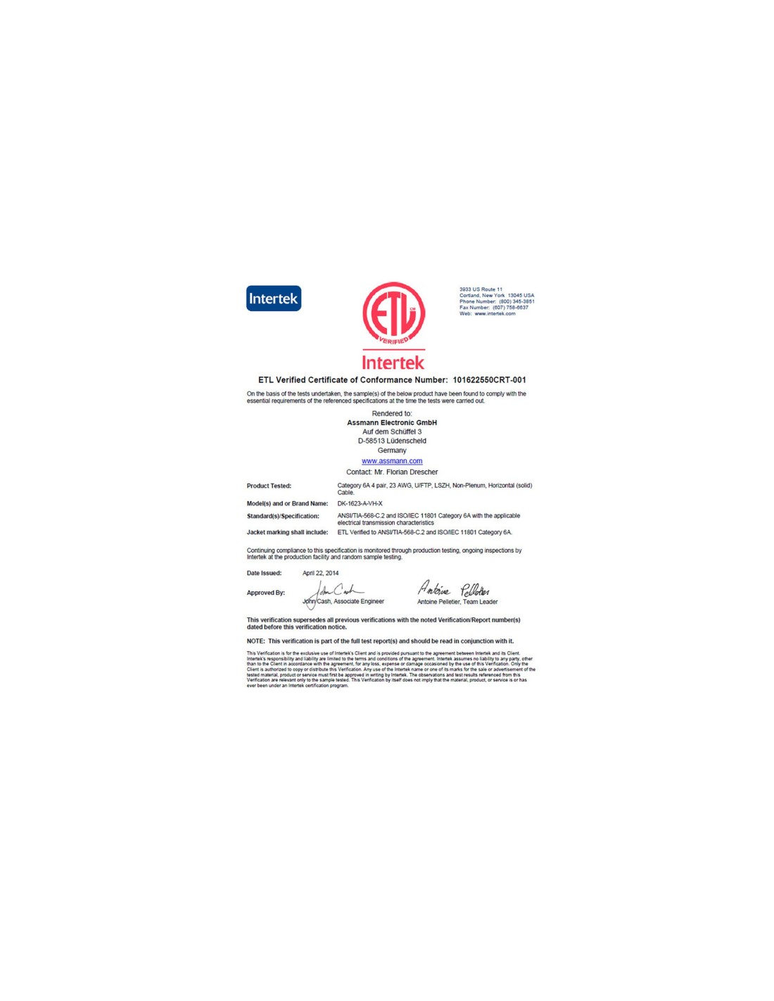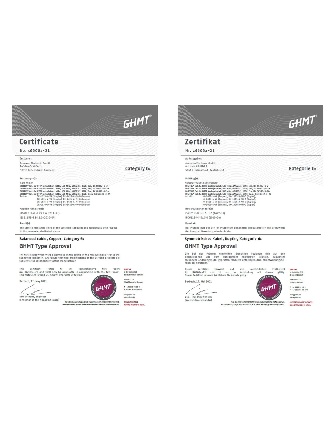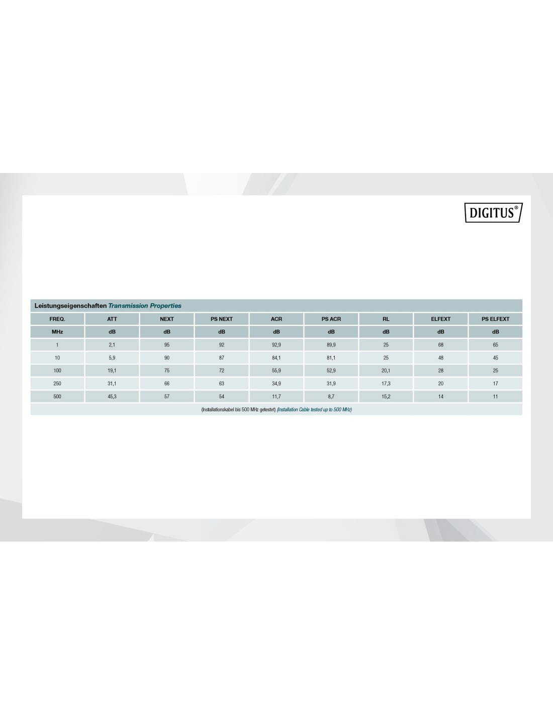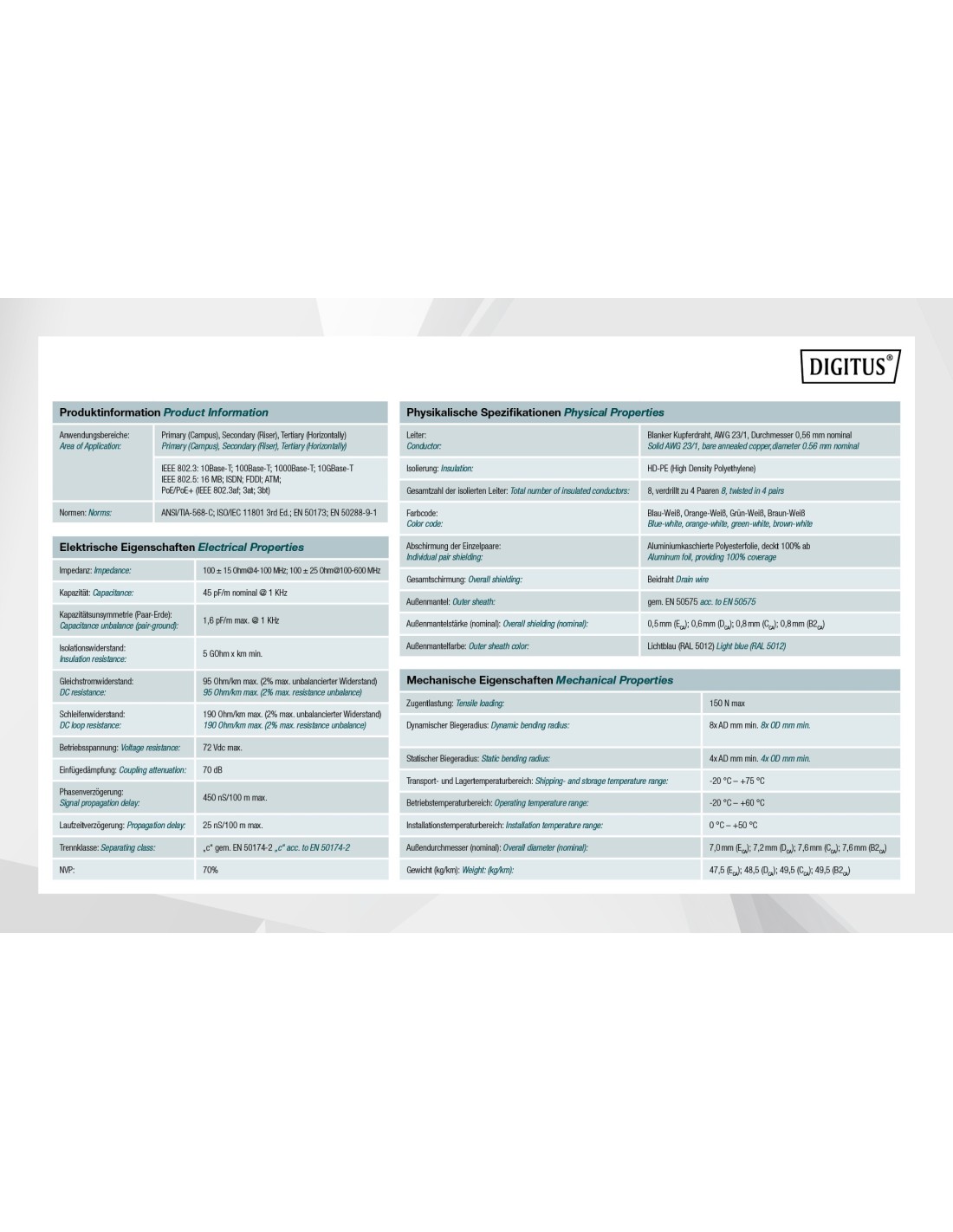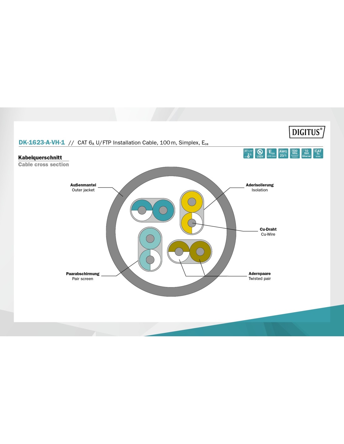 El cable de instalación Digitus® Cat.6A U/FTP se caracteriza por la siguiente estructura de cable: 4x2x AWG23/1 y alcanza una frecuencia de transmisión de hasta 500 MHz. La cubierta del cable libre de halógenos cumple con las normas IEC 60332-1, FRNC-B, LSZH-1 y BauPVO Euroclass Eca. El cable es adecuado para cableado estructurado de edificios en los sectores secundario y terciario. Cumple con ISO/IEC 11801, DIN EN 50173, DIN EN 50288-10-1.