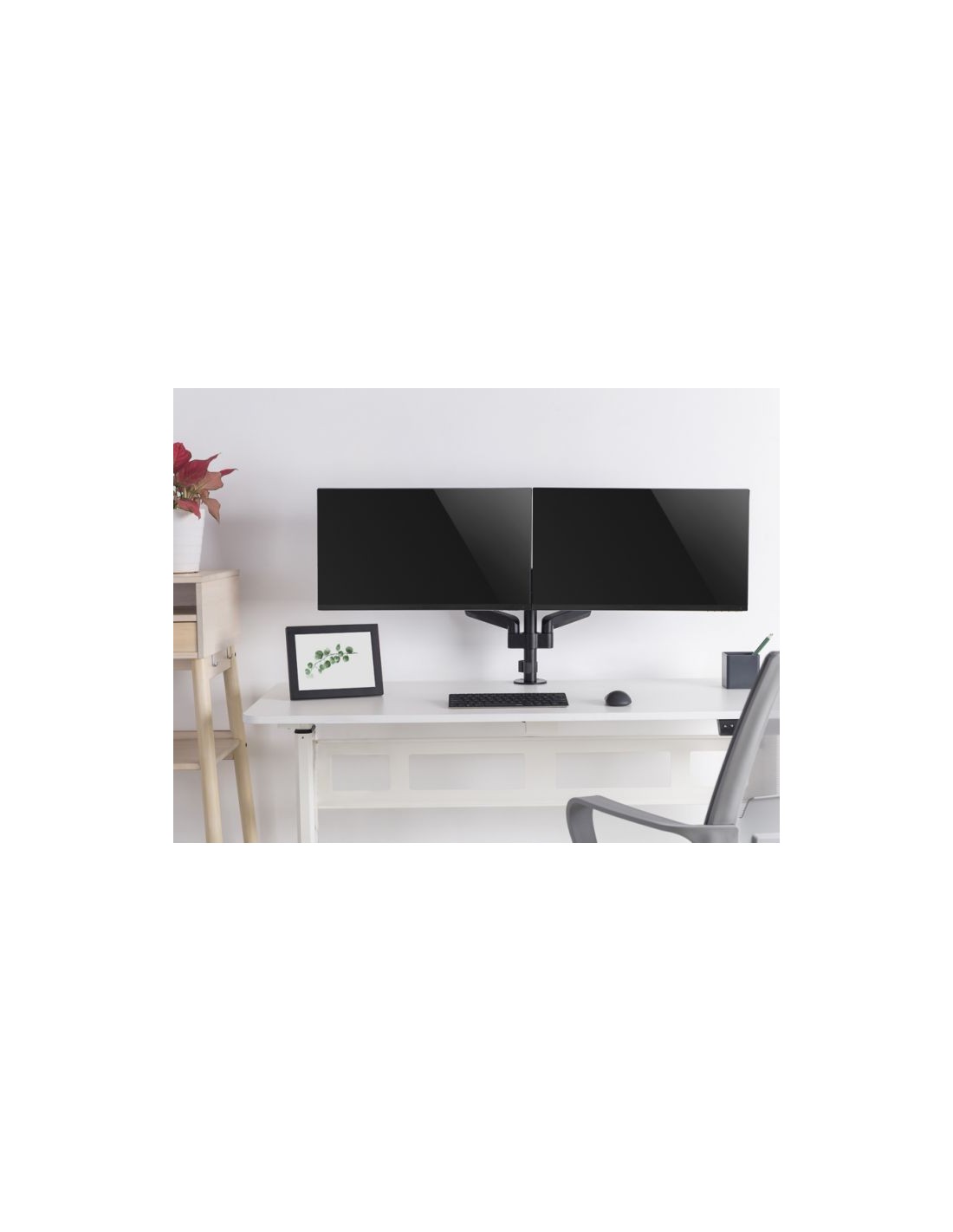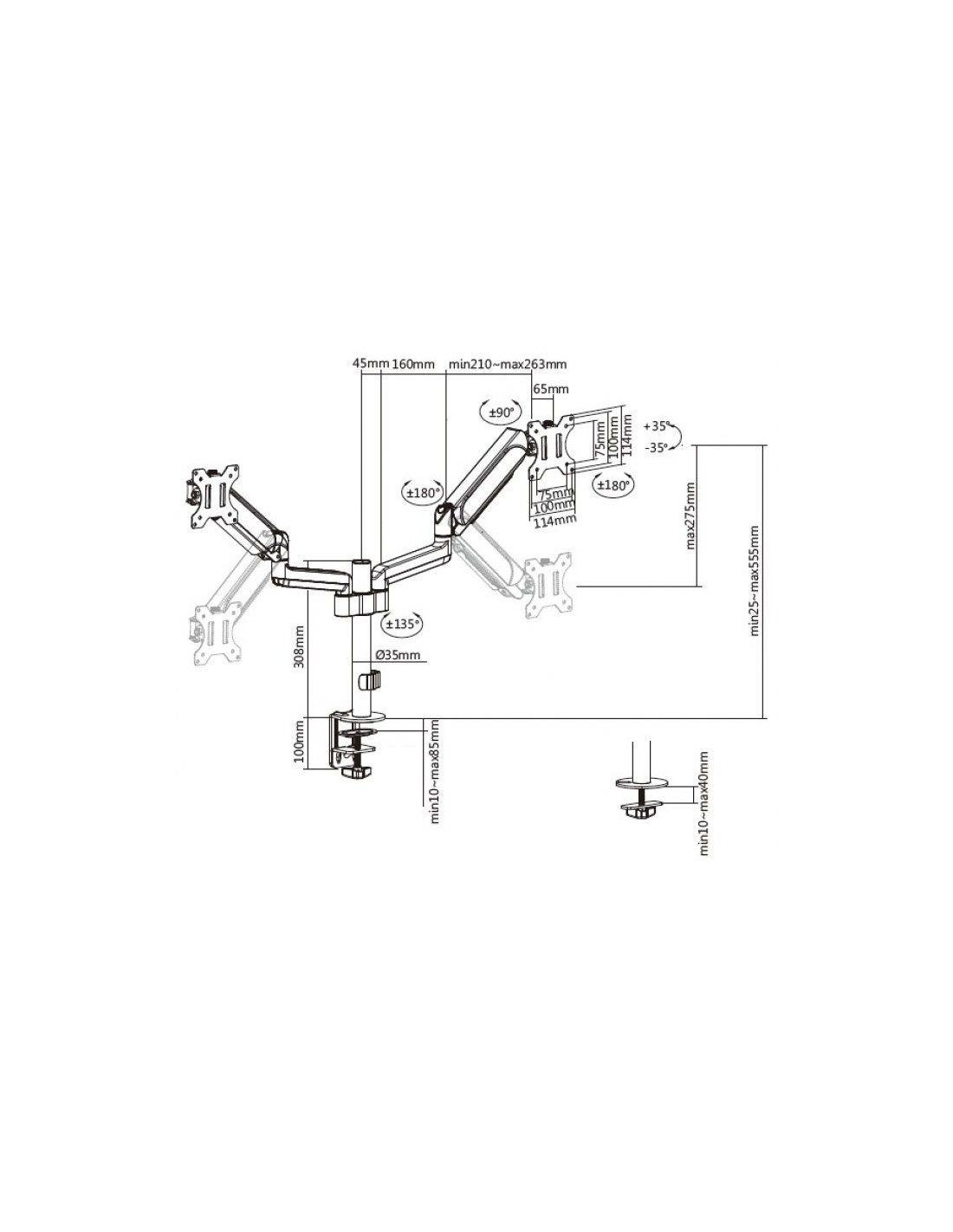 El soporte de escritorio para dos monitores de 17" a 32" de equip® con estructura de resorte a gas es una solución dinámica para mejorar su espacio de trabajo. Diseñado para alojar dos monitores de entre 17 y 32 pulgadas de tamaño, este soporte ofrece un sistema de resorte a gas fácil de usar que permite realizar ajustes de altura, ángulos de inclinación, giro y rotación sin esfuerzo. Esto le permite colocar fácilmente sus monitores para lograr una comodidad ergonómica y ángulos de visión óptimos.