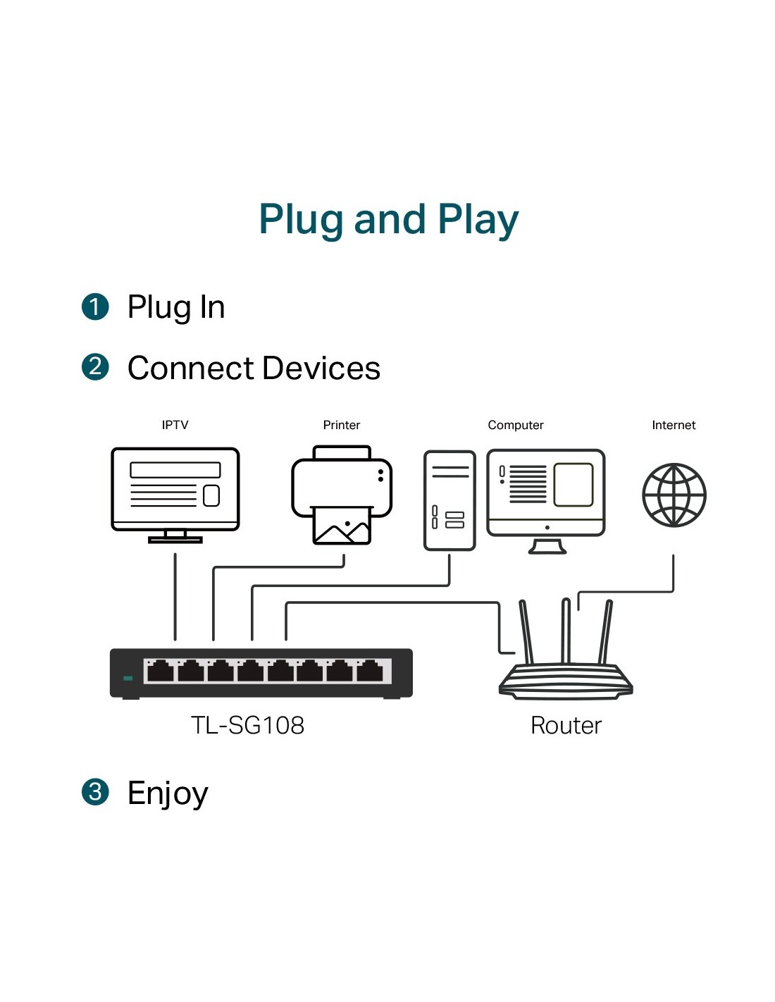 - 8 puertos RJ45 de negociación automática a 10/100/1000 Mbps que admiten Auto-MDI / MDIX