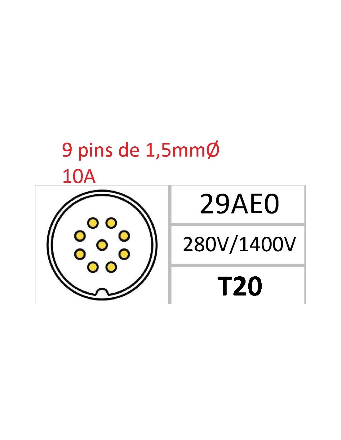 CONECTOR MACHO AEREO 9-PINS T-20 CON RACOR 10A 280V÷1400V