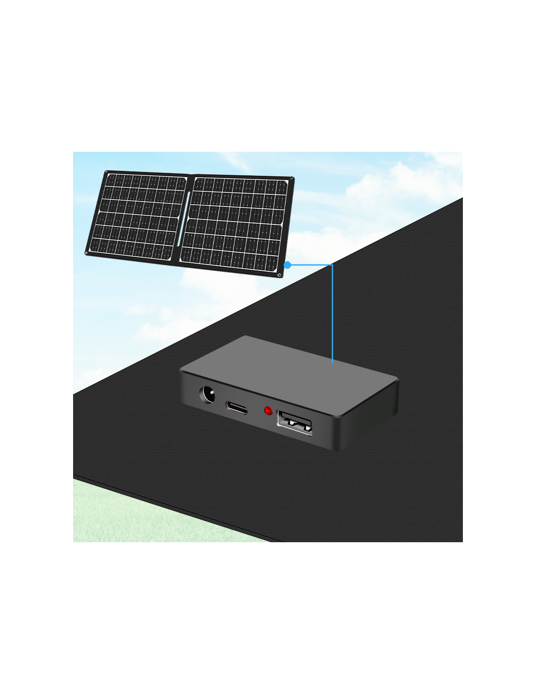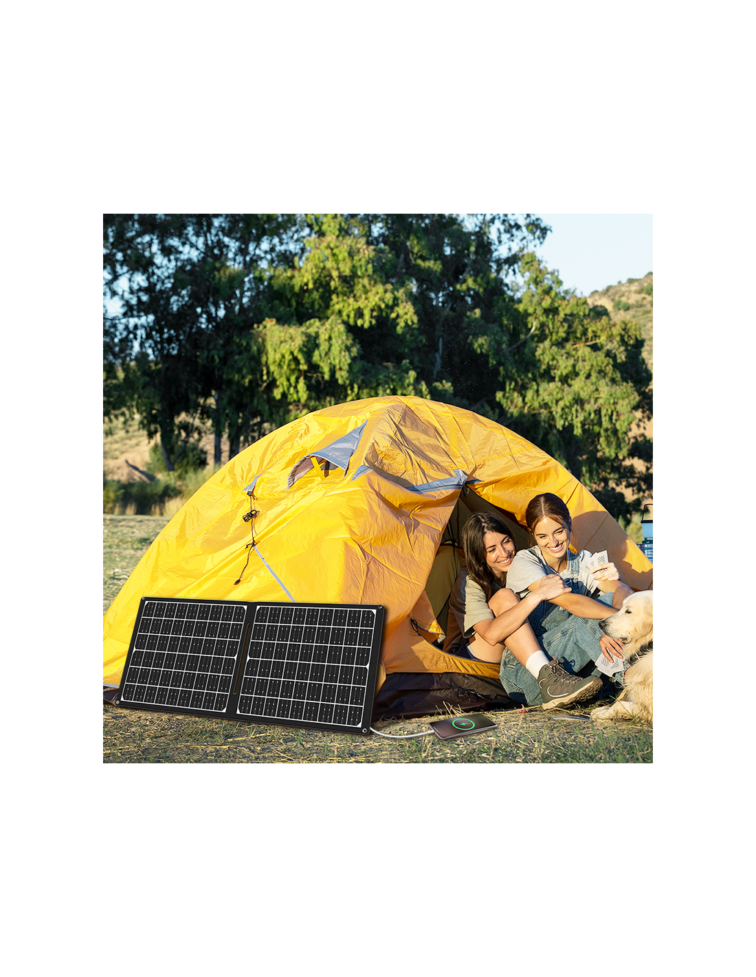 - Panel solar plegable, perfecto para usar en casa, mientras acampas o viajas.