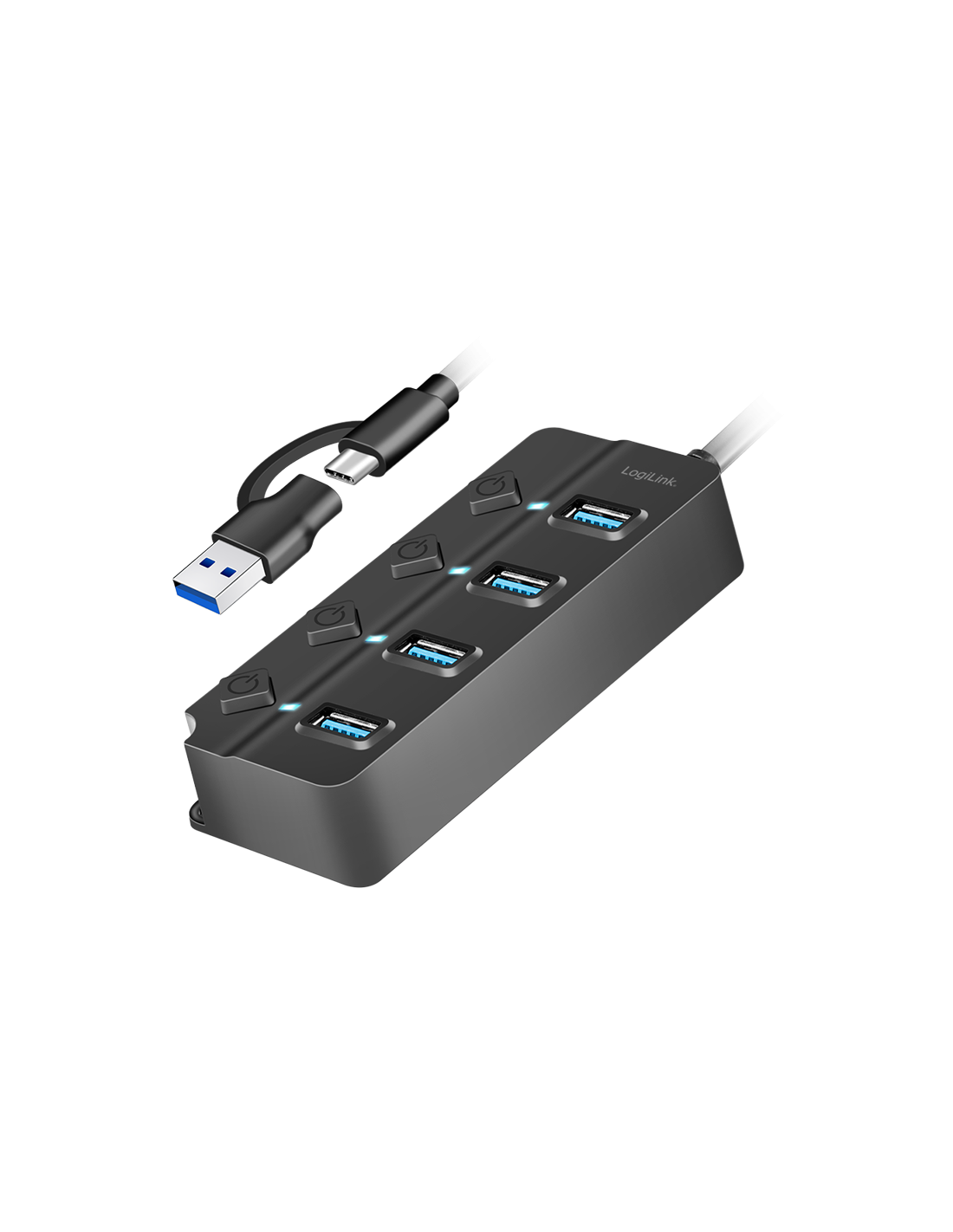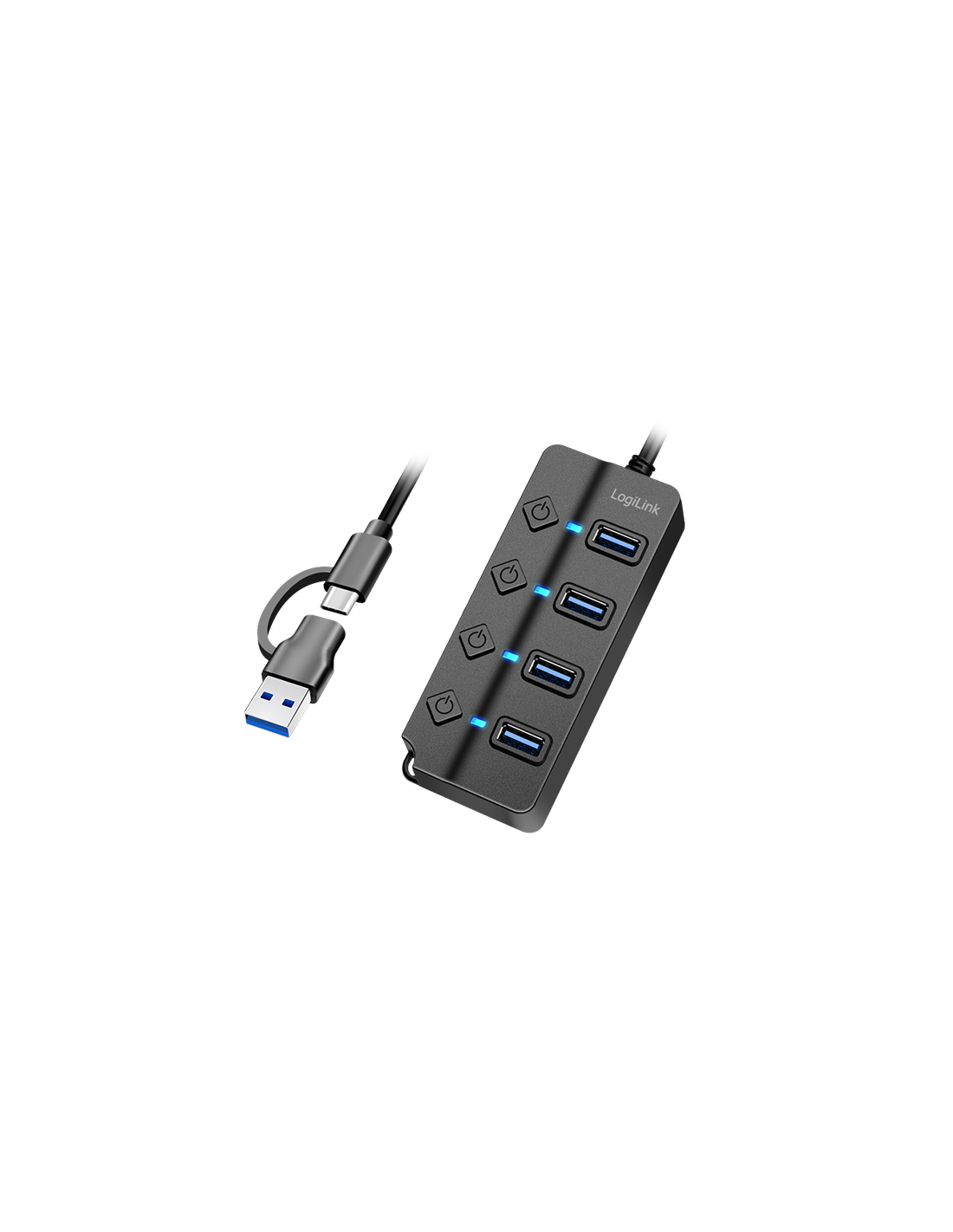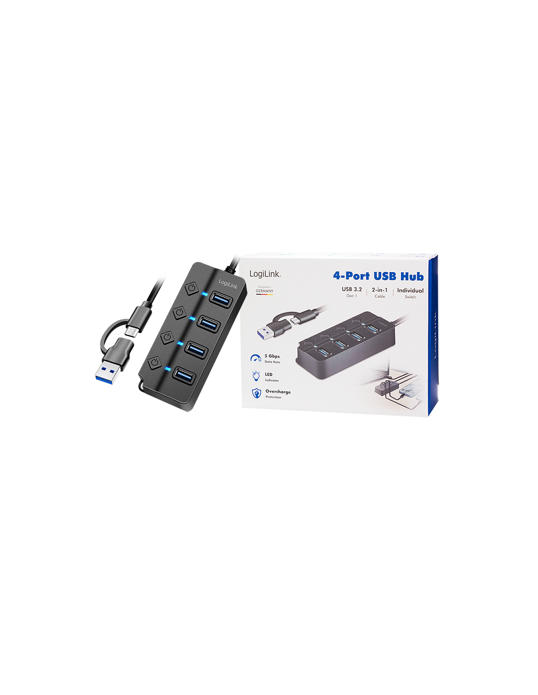 Este concentrador USB es más que un simple distribuidor. Con sus puertos conmutables individualmente y una variedad de funciones de protección, le ofrece máximo control y seguridad. Gracias a los puertos de datos USB 3.2 Gen 1, podrá disfrutar de una transferencia de datos ultrarrápida de hasta 5 Gbit/s. Perfecto para archivos grandes, vídeos de alta resolución y aplicaciones exigentes. Además, cada puerto está equipado con su propio interruptor de encendido/apagado. Esto le permite activar o desactivar dispositivos individuales sin afectar a los demás. La pantalla LED le muestra el estado de cada puerto de un vistazo. El adaptador de corriente de 5 V/3,5 A (17,5 W) incluido garantiza un suministro de energía estable incluso para dispositivos exigentes.