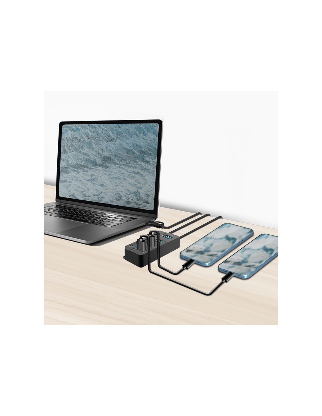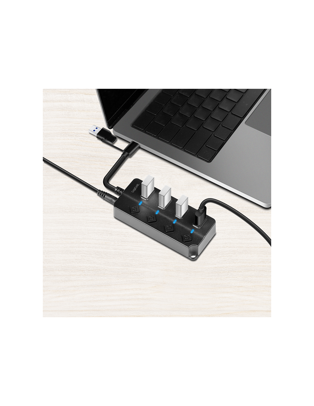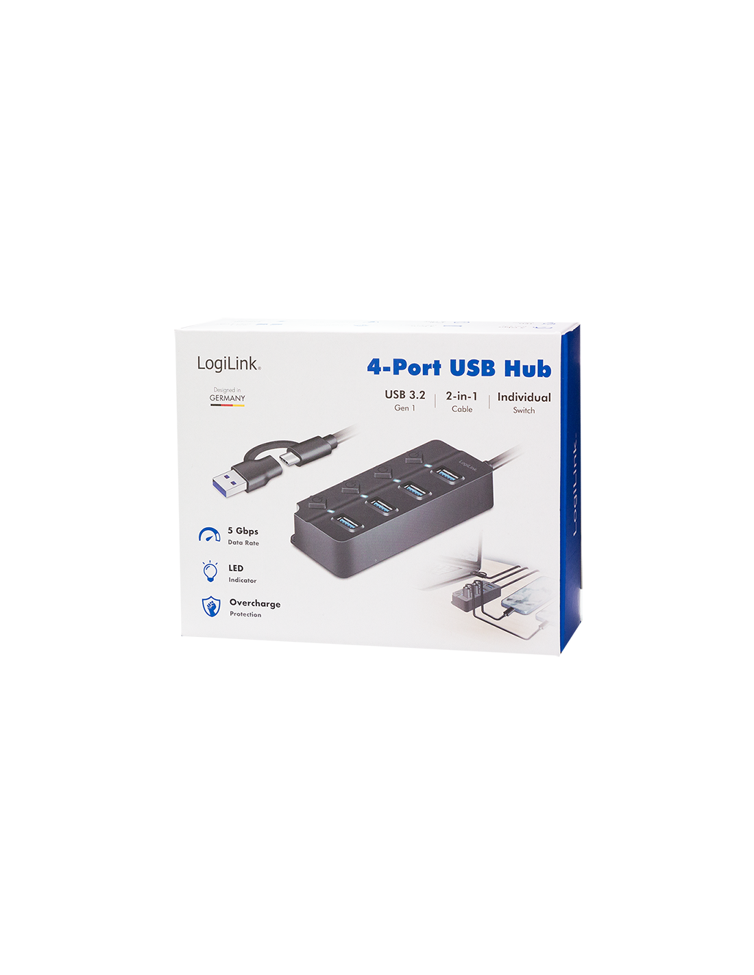 Este concentrador USB es más que un simple distribuidor. Con sus puertos conmutables individualmente y una variedad de funciones de protección, le ofrece máximo control y seguridad. Gracias a los puertos de datos USB 3.2 Gen 1, podrá disfrutar de una transferencia de datos ultrarrápida de hasta 5 Gbit/s. Perfecto para archivos grandes, vídeos de alta resolución y aplicaciones exigentes. Además, cada puerto está equipado con su propio interruptor de encendido/apagado. Esto le permite activar o desactivar dispositivos individuales sin afectar a los demás. La pantalla LED le muestra el estado de cada puerto de un vistazo. El adaptador de corriente de 5 V/3,5 A (17,5 W) incluido garantiza un suministro de energía estable incluso para dispositivos exigentes.