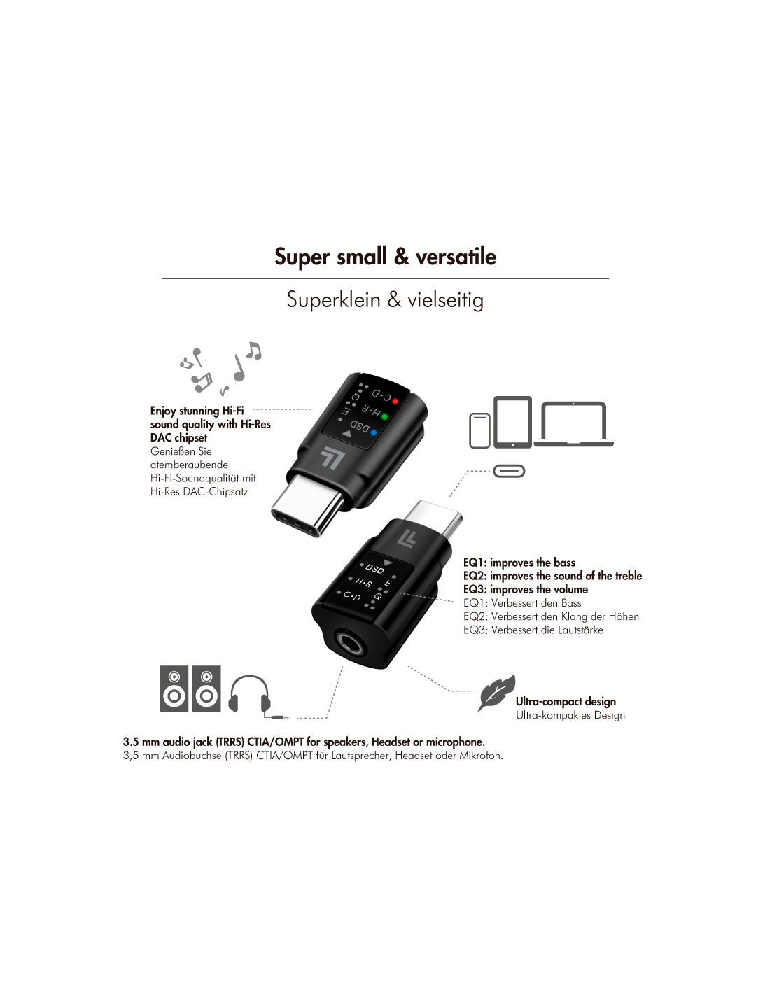¿Tu smartphone o tablet ya no tiene una salida jack de 3,5 mm para auriculares, sino solo un puerto USB-C? Entonces, el adaptador DAC es la solución ideal: simplemente conecta el UA0424 al puerto USB-C y el jack de tus auriculares al adaptador. Podrás usarlo sin problemas y disfrutar de un sonido mejorado gracias a la decodificación DAC y PCM/DSD, que mejora aún más el sonido de tu música. Con el ecualizador integrado, puedes ajustar el sonido a tus preferencias.