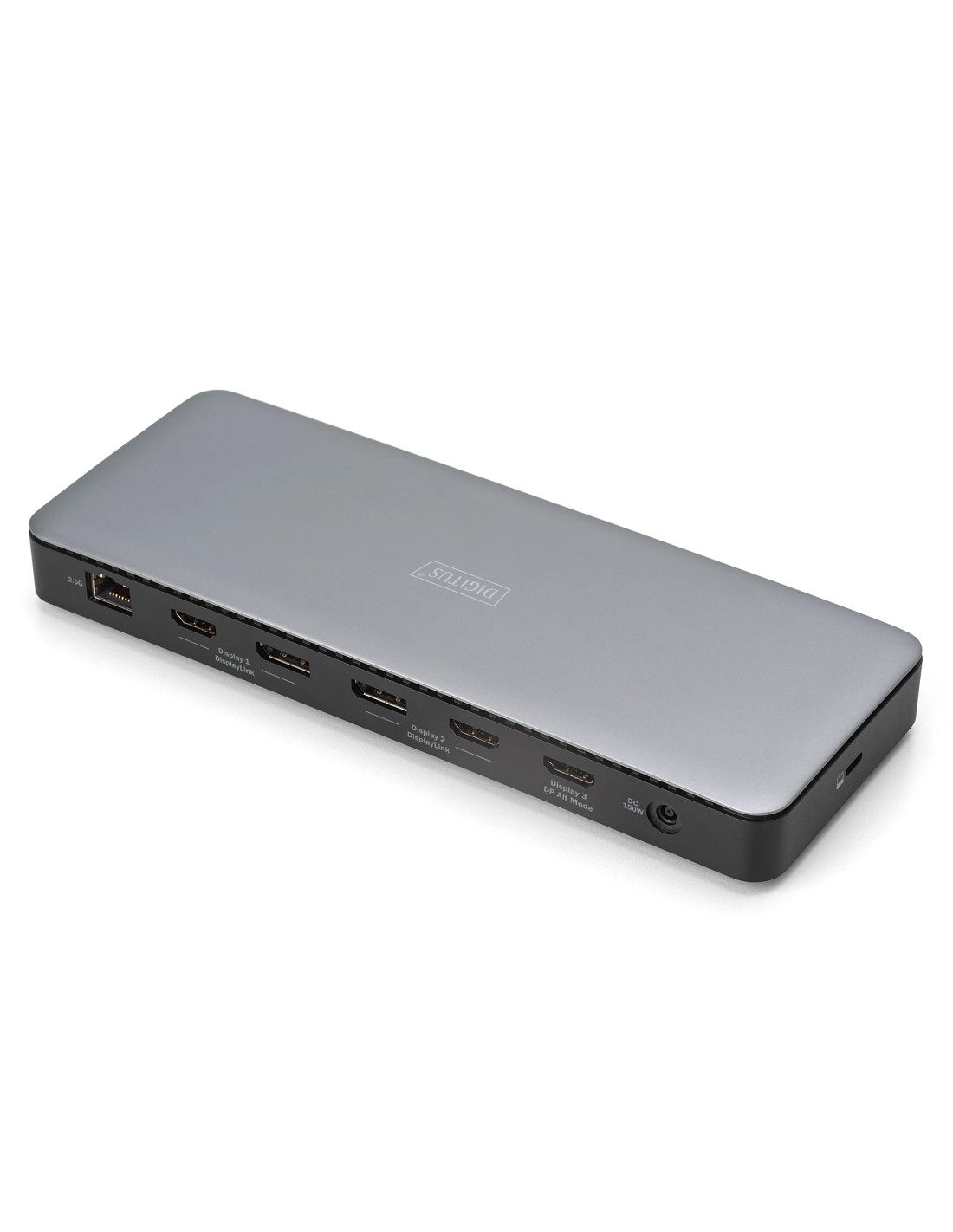 Amplíe su lugar de trabajo con 13 opciones de conexión adicionales y utilice la amplia gama de opciones de conectividad. La base permite configurar monitores dobles o triples (4K/60 Hz en todos los monitores) en modo MST (extensión de pantalla) para Windows, macOS (incluidos los chipsets M1, M2, M3), ChromeOS y PC con Linux. Elija entre 3x conexiones HDMI o 2x DisplayPort y combínelas como desee. Benefíciese de transferencias de datos ultrarrápidas gracias a 3x puertos USB-A 3.2 Gen 1 (5 Gbit/s), 1x USB-A 3.2 Gen 2 (10 Gbit/s) y 1x USB-C 3.2 Gen 2 (10 Gbit/s), algunos de los cuales también admiten la carga de dispositivos móviles a 1,5 A. Una conexión Gigabit Ethernet (RJ45) con 2500 Mbit/s garantiza una conexión de red perfecta. La fuente de alimentación suministrada (21 V/7,1 A, 150 W) suministra suficiente energía a la base de conexión y al portátil durante su uso. La toma de audio de 3,5 mm y el cable de conexión USB-C 3.2 Gen 2 reversible de 100 cm ofrecen flexibilidad adicional. La estación de acoplamiento admite DP 1.4 Alt Mode (compatible con DP 1.2), HDR y HDCP 2.2/1.4. Tenga en cuenta que se requiere una instalación manual de controladores (DisplayLink) para su sistema operativo para utilizar la funcionalidad completa (monitor doble/triple y audio) de la base de acoplamiento.