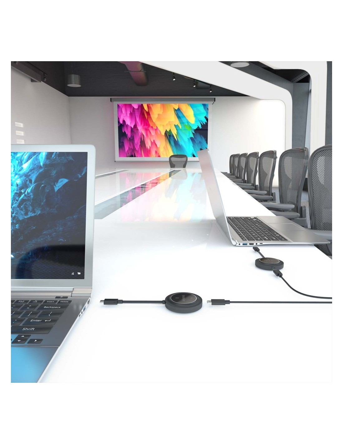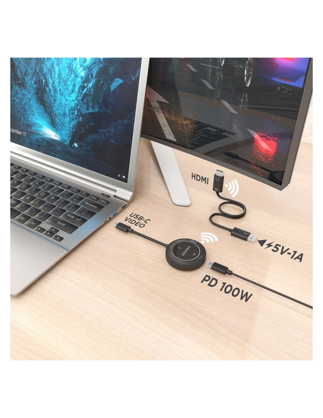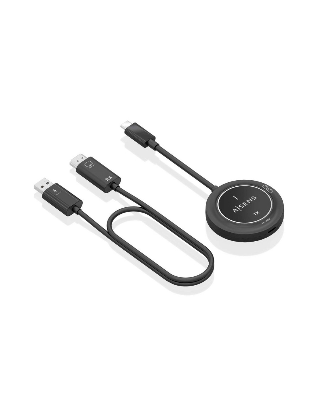 > El puerto USB-C hembra del transmisor solo soporta carga USB-C PD de 100W para el portátil. No admite transferencia de datos, por lo que no se pueden conectar accesorios o periféricos como pendrives, discos duros, ratones o teclados.