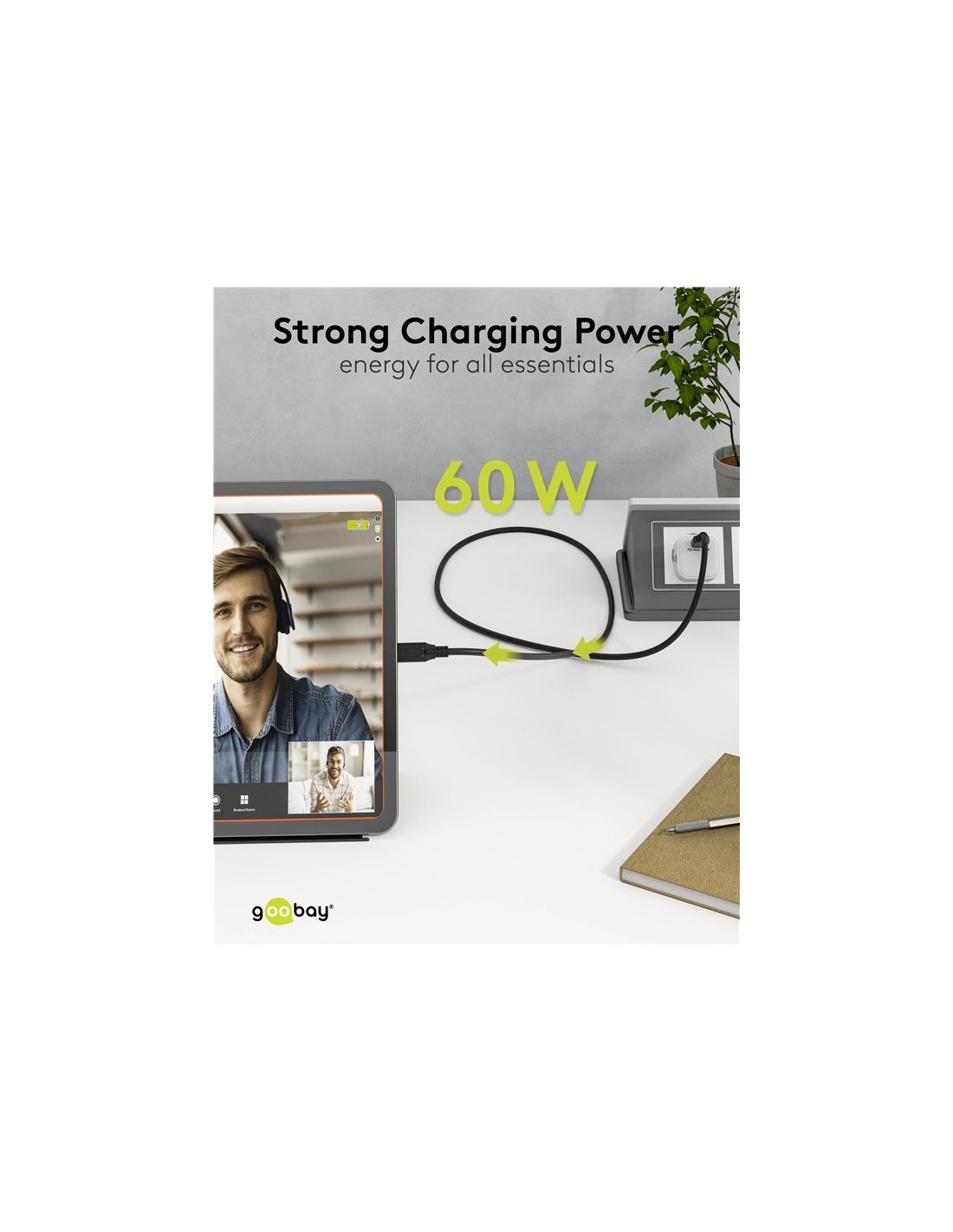 - Con una potencia de 60 W, el cable de carga USB-C™ está perfectamente diseñado para alimentar computadoras portátiles, tabletas, pantallas, SSD, consolas de juegos o concentradores.
