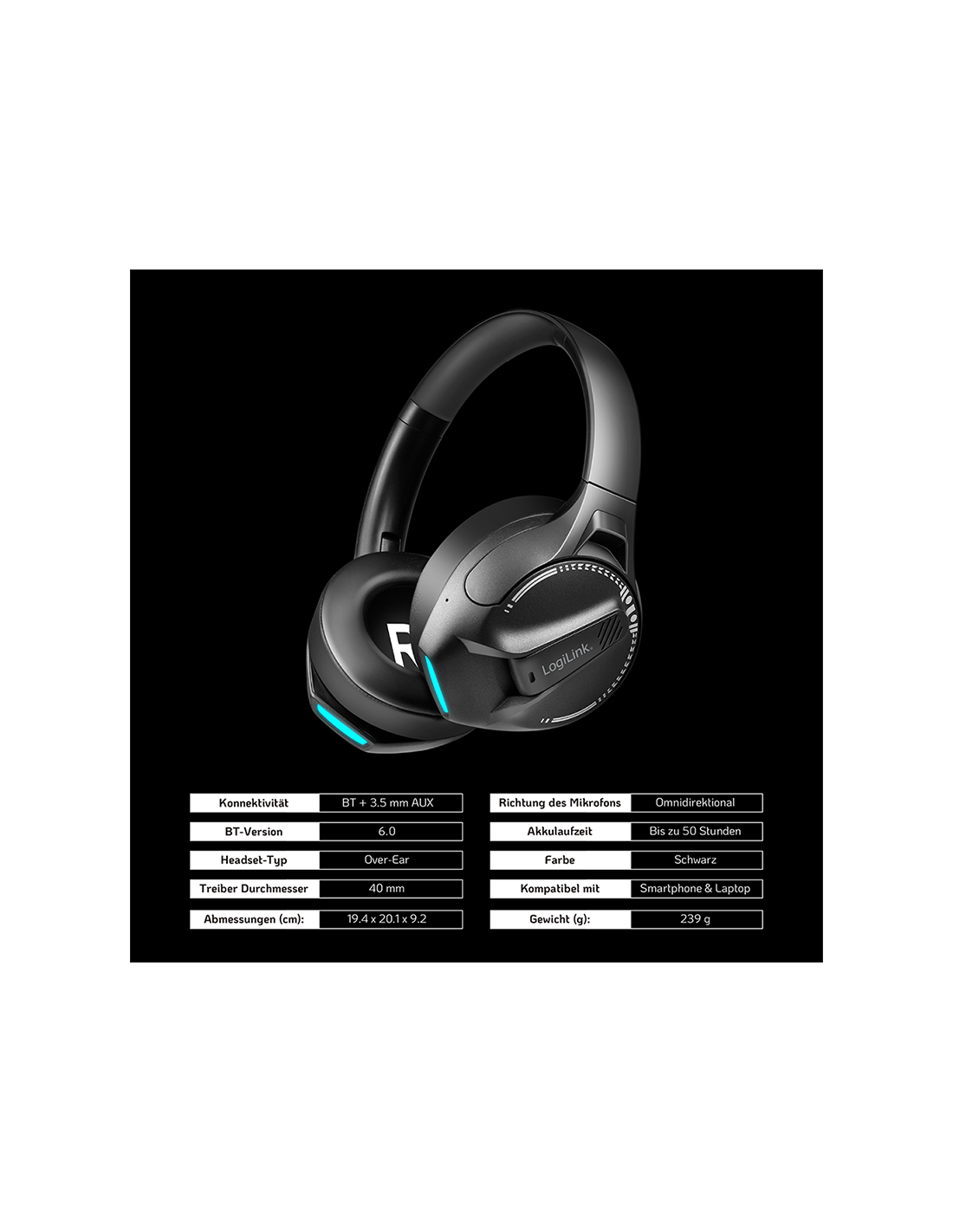 Información del producto "Auriculares para juegos BT 6.0, entrada auxiliar de 3,5 mm, diadema ajustable, batería de 50 horas, color negro".
