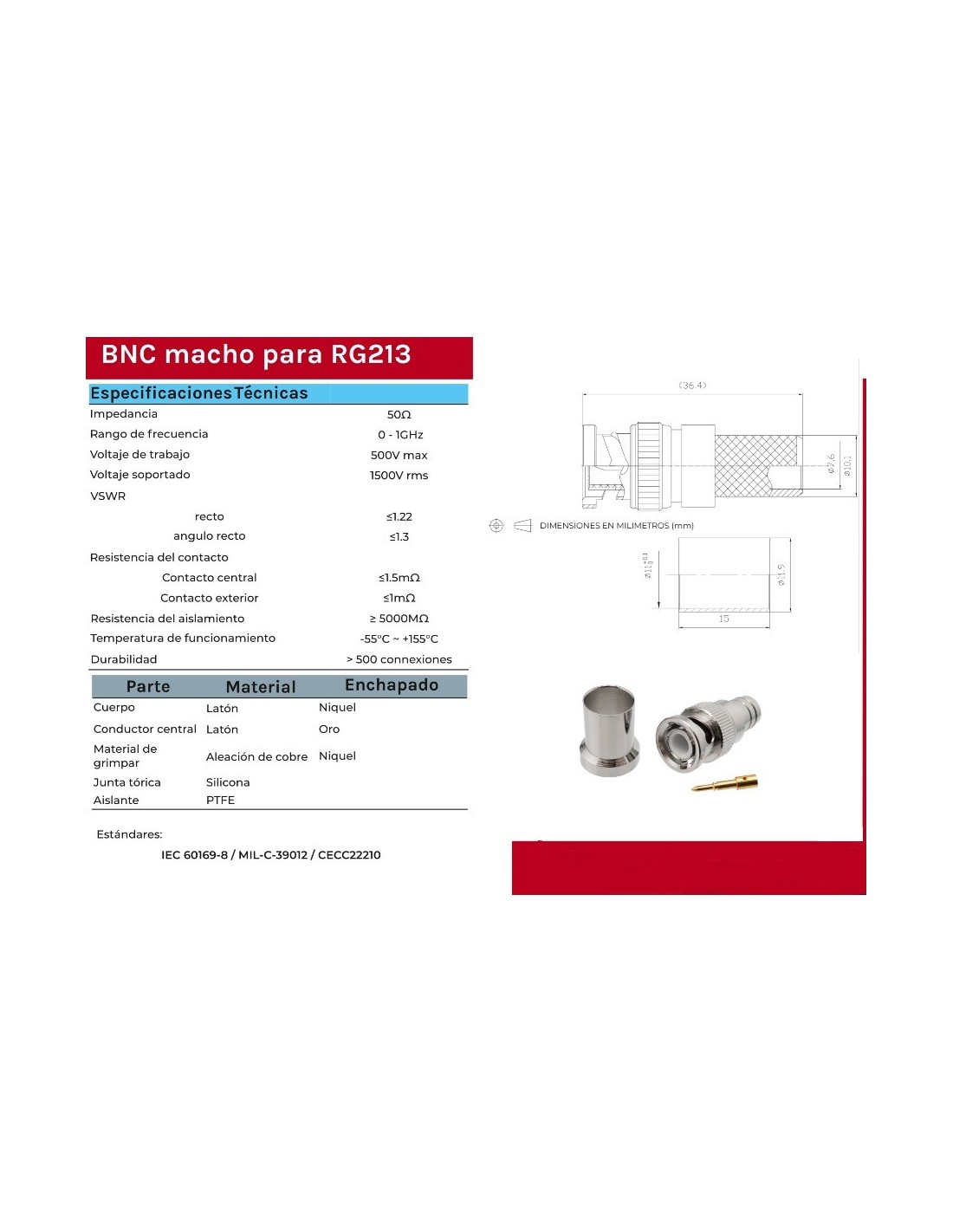 Conector BNC macho RG213. Crimpar. Con casquillo suelto. Pin dorado