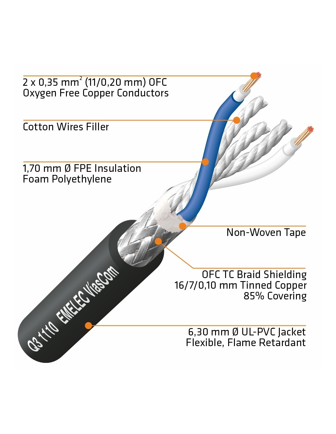 • Conductores de cobre OFC de 0,35mm² y aislamientos de PE de gas inyectado que aseguran una óptima transmisión para recorridos medios largos.