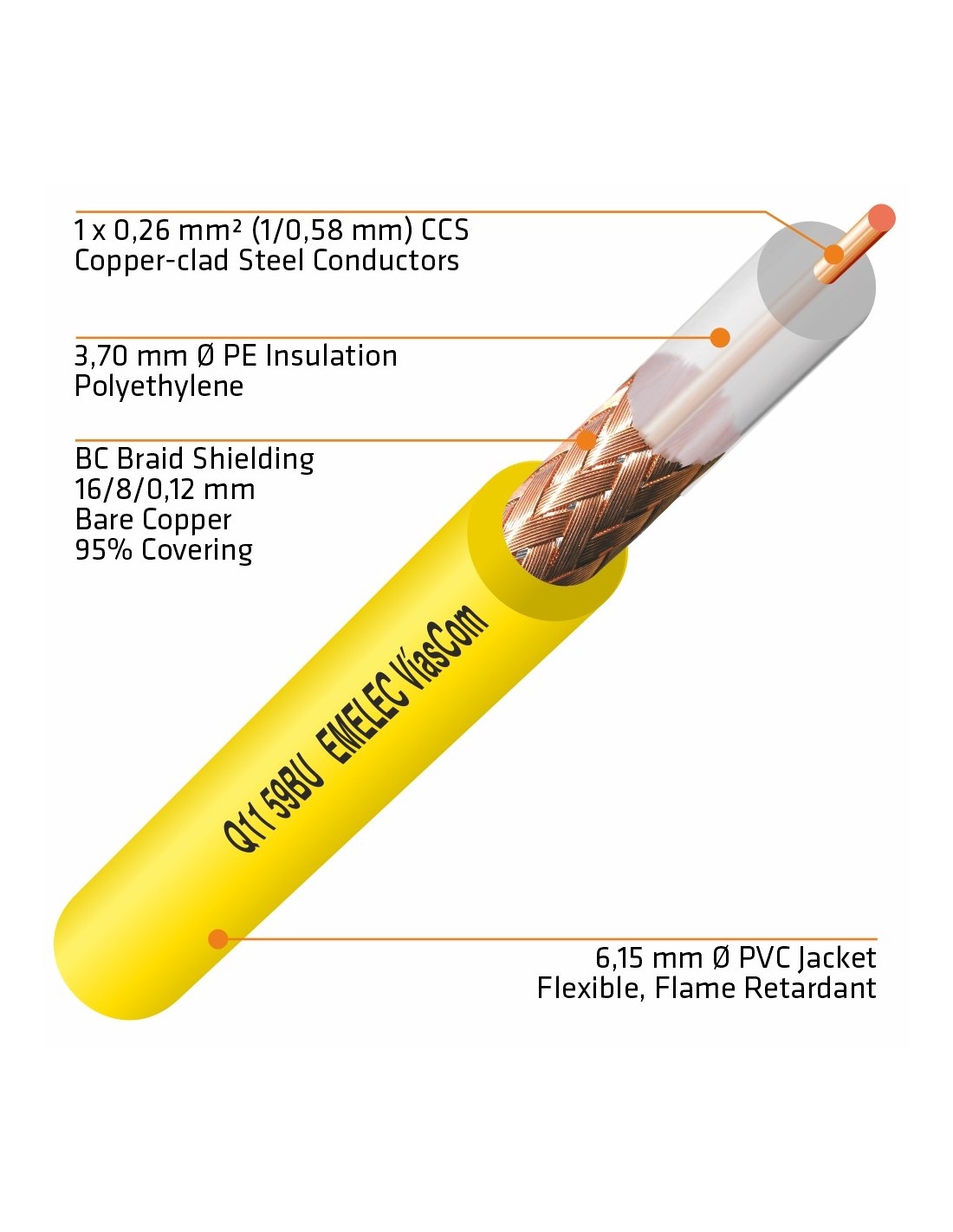 Estos cables coaxiales están cargados con una impedancia de 75Ω. Han sido desarrollados para la transmisión de señal de vídeo. El conductor central es rígido de 0,58 mm de diámetro. Su rendimiento eléctrico es de los mejores en su género.