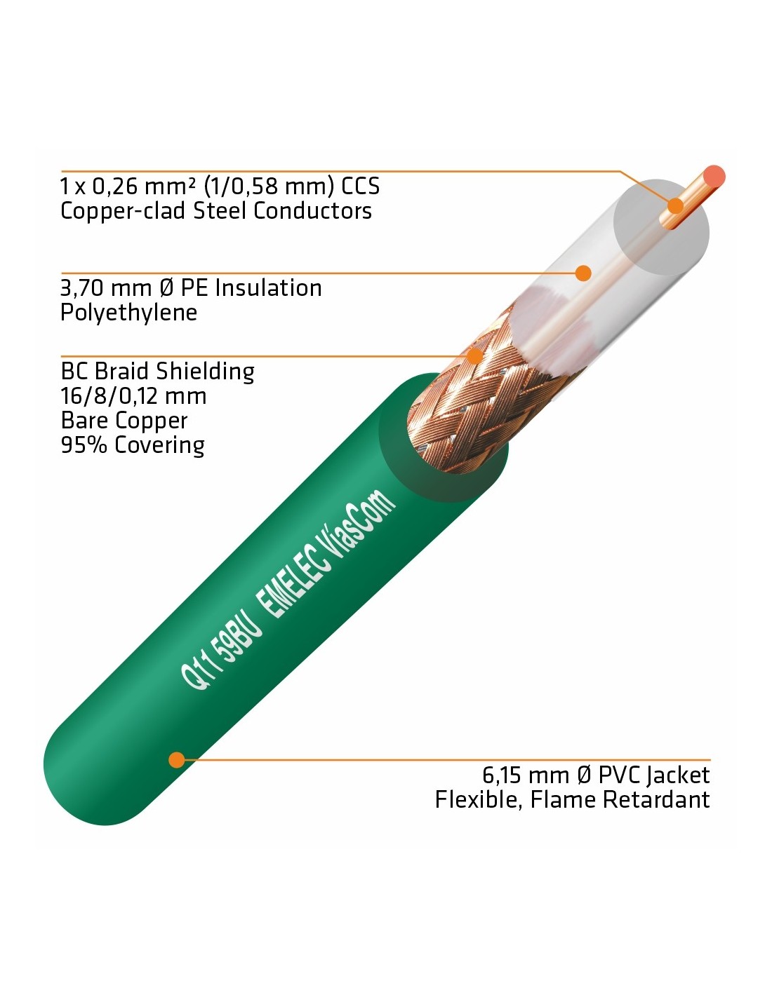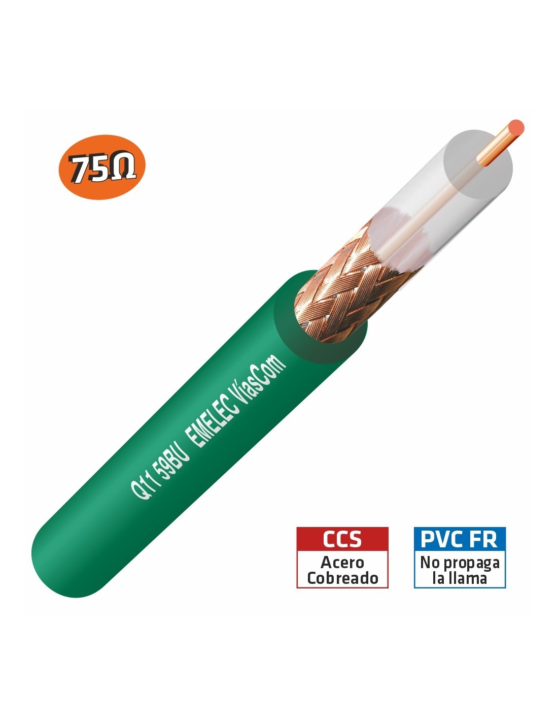 Estos cables coaxiales están cargados con una impedancia de 75Ω. Han sido desarrollados para la transmisión de señal de vídeo. El conductor central es rígido de 0,58 mm de diámetro. Su rendimiento eléctrico es de los mejores en su género.
