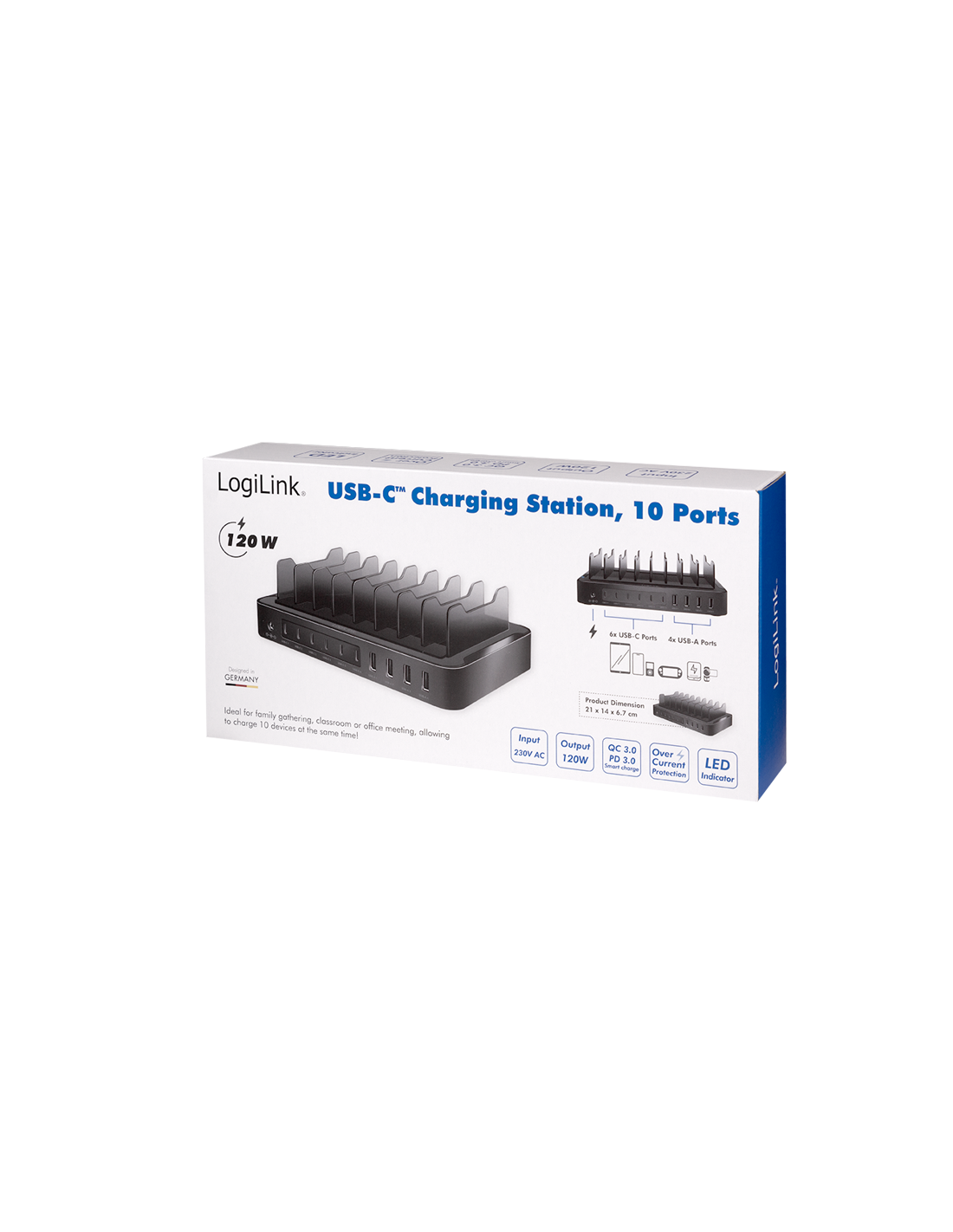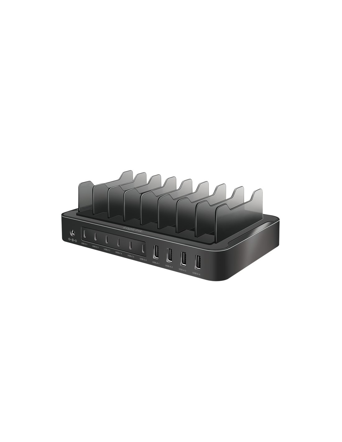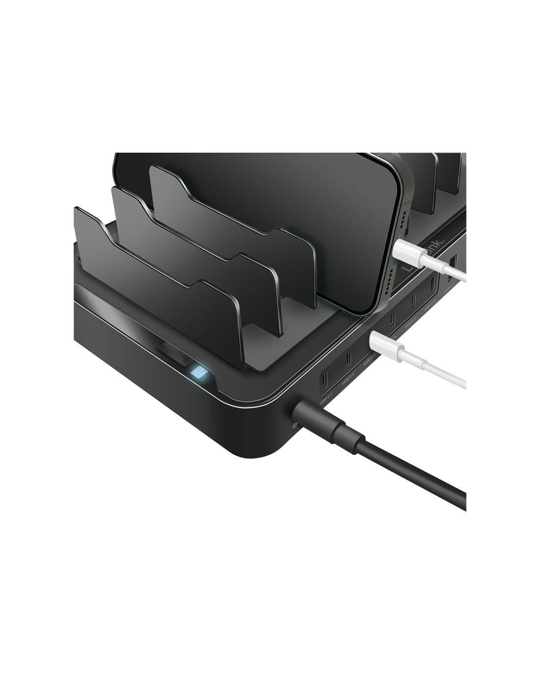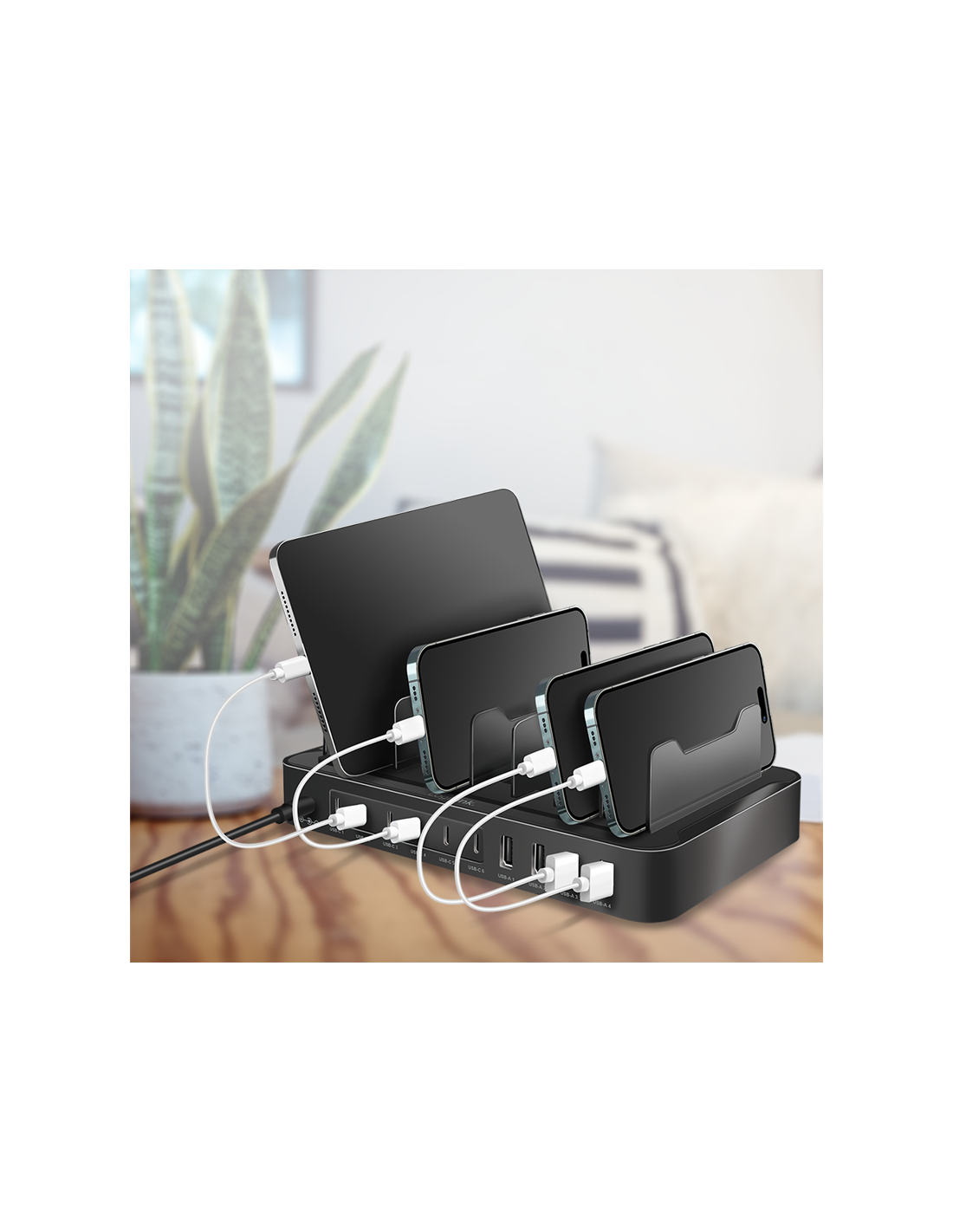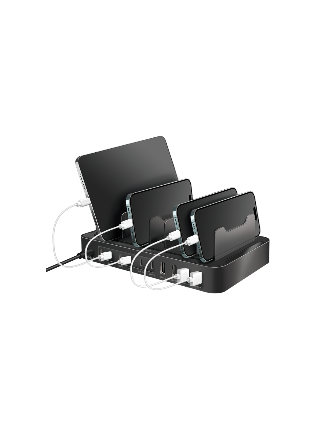 Con nuestra estación de carga de , puedes cargar hasta 10 dispositivos simultáneamente, lo cual resulta especialmente práctico si tienes varios aparatos electrónicos o si recibes visitas. Además, la combinación de puertos USB-C y USB-A ofrece una alta compatibilidad con una amplia gama de dispositivos, ya sean smartphones, tablets, portátiles u otros aparatos electrónicos. Esto convierte a la estación de carga en un dispositivo extremadamente versátil. Los dispositivos se guardan de forma ordenada y se evita el desorden de cables.