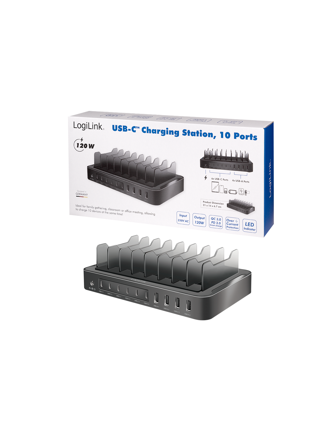 Información del producto: "Estación de carga USB-C, 4 puertos USB-A y 6 puertos USB-C, PD y QC 3.0, 120 W, color negro.