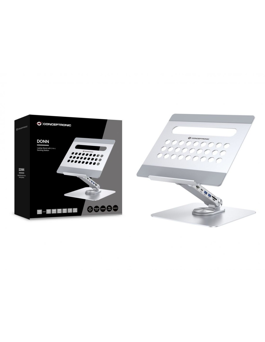 Mejora tu experiencia con el soporte para portátil gracias a nuestra estación de acoplamiento integrada 7 en 1, que amplía las capacidades USB-C de tu dispositivo. El soporte ofrece altura y ángulo ajustables para una posición ergonómica óptima, además de una base giratoria de 360° para trabajar en diferentes posturas.La estación de acoplamiento 7 en 1 incluye puertos HDMI, USB-C PD, USB-A y USB-C, además de lectores de tarjetas SD y microSD/TF. Conecta tu portátil, tableta o smartphone con puerto USB-C a una pantalla con HDMI y disfruta de una impresionante resolución 4K Ultra HD a 60 Hz.Disfruta de una transmisión de datos estable y eficiente con velocidades de transferencia de hasta 5 Gbps gracias a los puertos USB-C y USB-A. Ideal para entretenimiento en casa, presentaciones de oficina y clases.