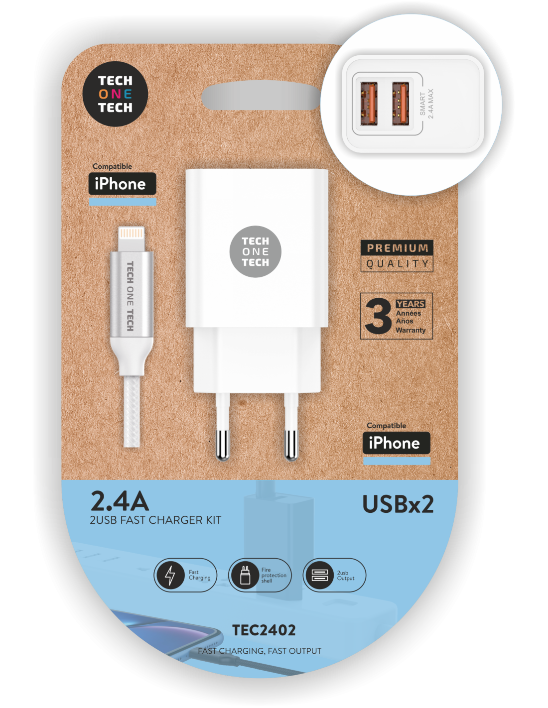 KIT compuesto por cargador rápido doble con entrada de 100-240V, dos salidas USB de 2,4 A. color blanco, medidas 37mm x24mm x 77 mm, peso 40 gramos y Cable de datos y carga rápida de 1 m. de longitud compatible iPhone, con conector Lightning, cable recubierto de Nylon trenzado y conectores metálicos para una mayor resistencia y durabilidad, Salida 2x inteligente: 2 puertos de salida que se adaptan automáticamente a la corriente requerida para la carga, 2,4A cuando cargamos un solo dispositivo y 1A cuando cargamos 2 dispositivos simultáneamente. Smart recognition: Incorpora microchip de gestión de energía, identificación inteligente (IC), carga de manera eficiente y protege completamente su equipo. Fire retardant Shell: Fabricado en PC/ABS, proporciona una alta resistencia al calor e impactos, así como un amplio rango térmico de funcionamiento. Normativas y seguridad: Cumple con las normas de CE, FCC y ROHS. Multi-protecciones contra sobrecarga y cortocircuito previenen efectivamente los posibles daños a tus dispositivos . La más alta calidad del mercado con la mayor garantía. Productos pensados para durar.