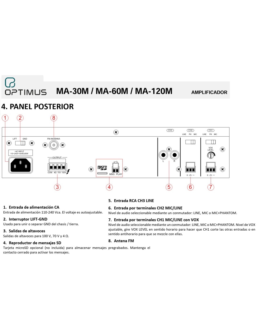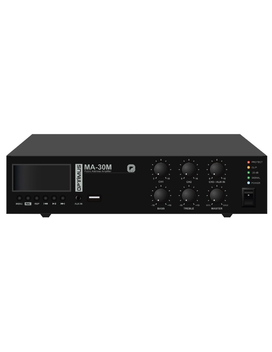AMPLIFICADOR 30 WRMS 100V 1-AUX 2-MIC OPTIMUS