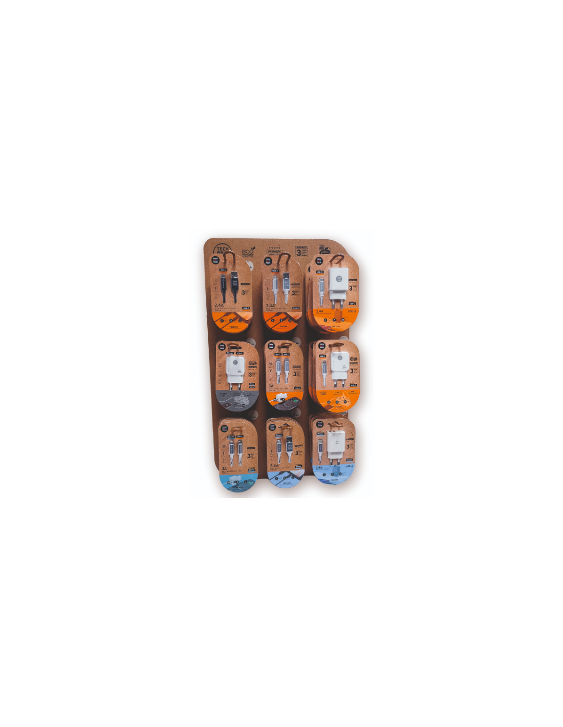 Elegante expositor de peana TECH ONE TECH, con 9 ganchos y 3 productos en cada gancho, total 27 productos de cargadores y cables más vendidos.