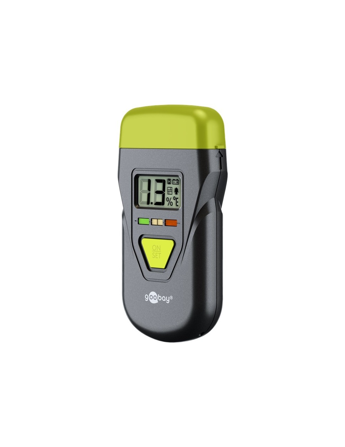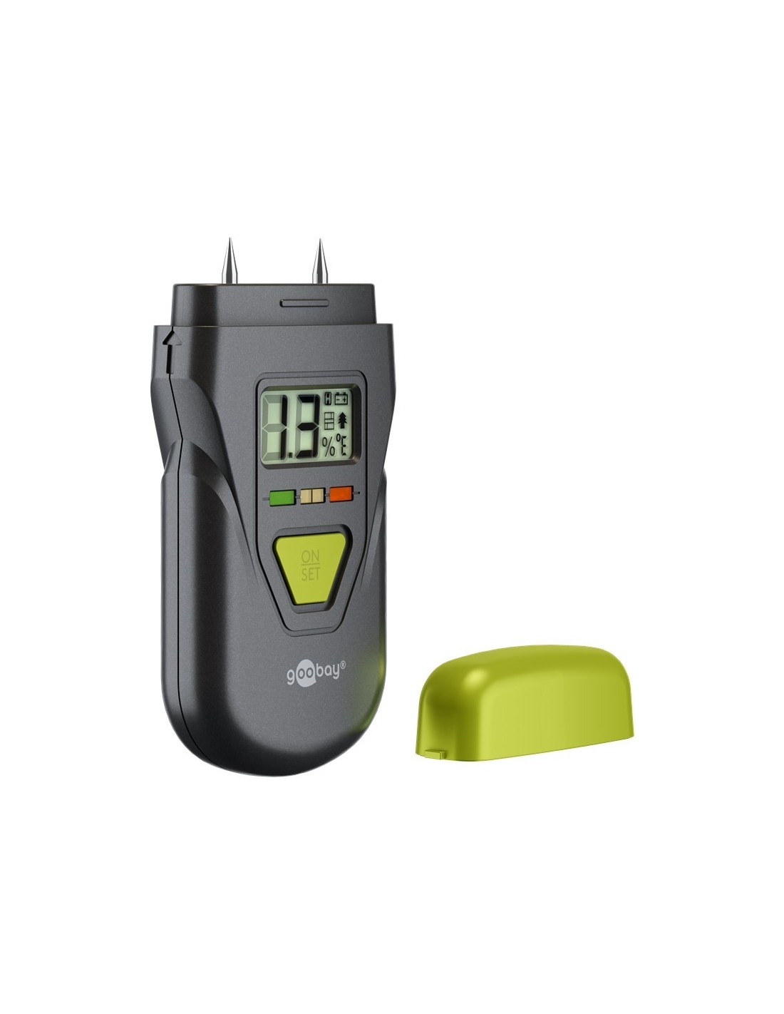 Medidor de humedad ultracompacto con 2 modos para una detección precisa de la humedad en madera o cartón (6–60 %) y en materiales sólidos como hormigón o yeso (0,2–2,9 %).