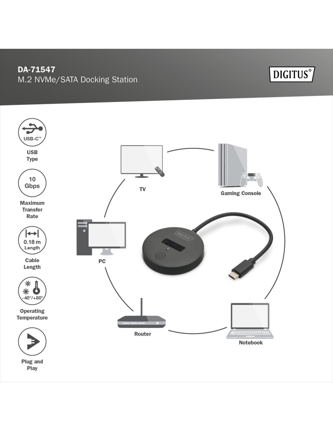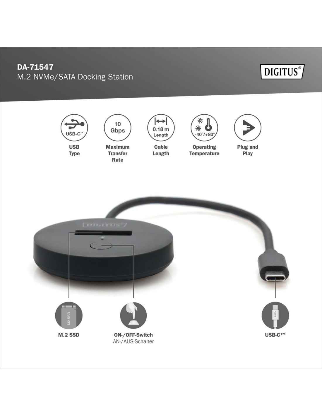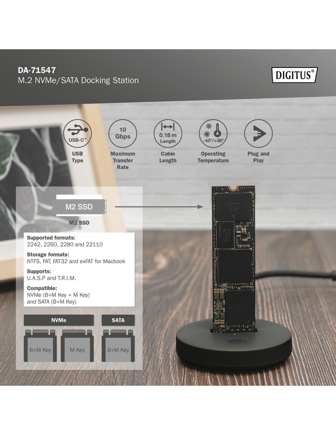 La estación de acoplamiento SSD de DIGITUS® puede alojar SSD M.2 con tecnología NVMe o SATA de hasta 4 TB. Admite unidades SSD NVMe con B+M Key y M-Key, así como unidades SSD SATA con B+M-Key, cada una en los formatos 2242, 2260, 2280 y 22110. Amplía fácilmente la capacidad de almacenamiento de numerosos dispositivos USB-C™ como PC, portátiles, televisores, videoconsolas o routers.