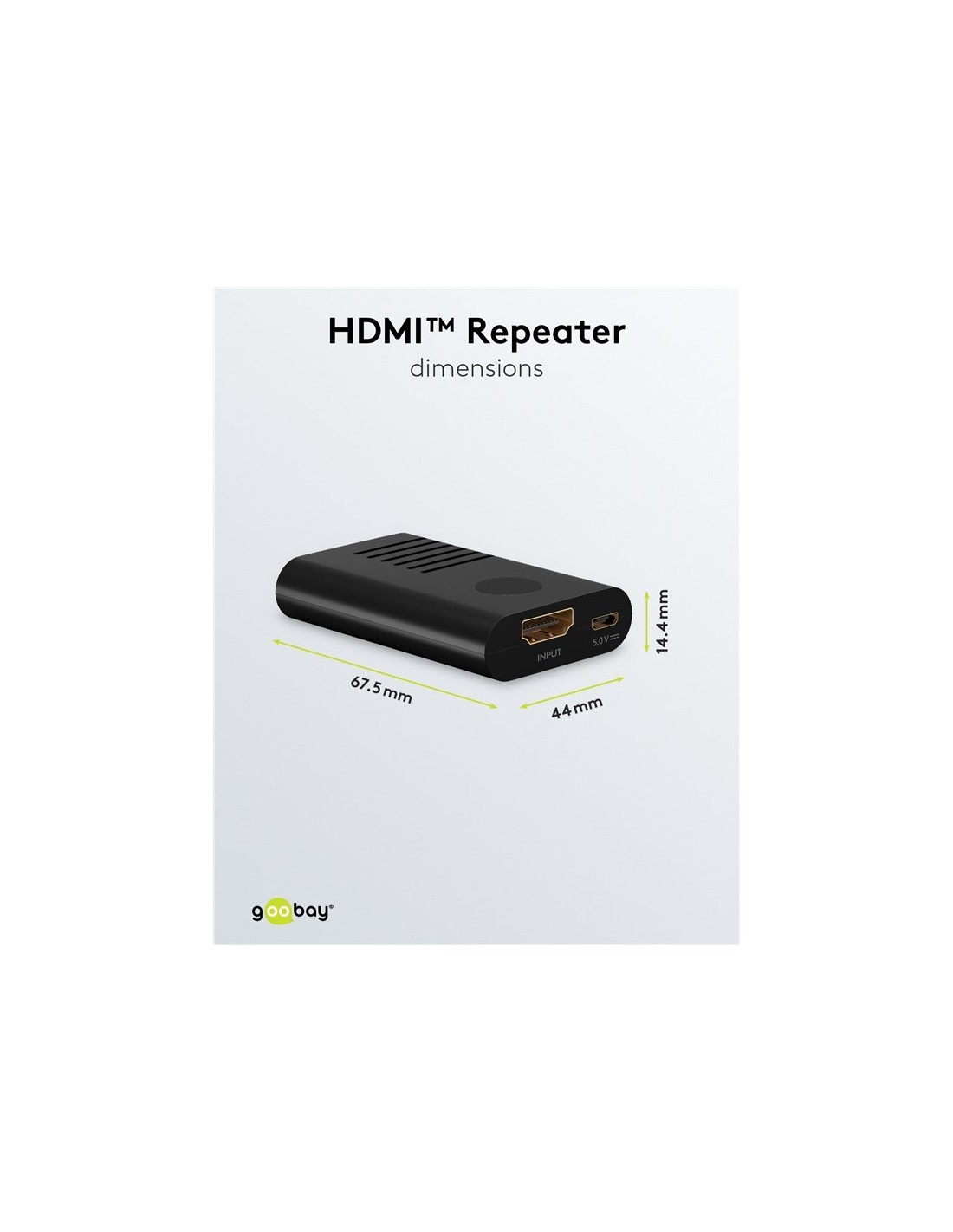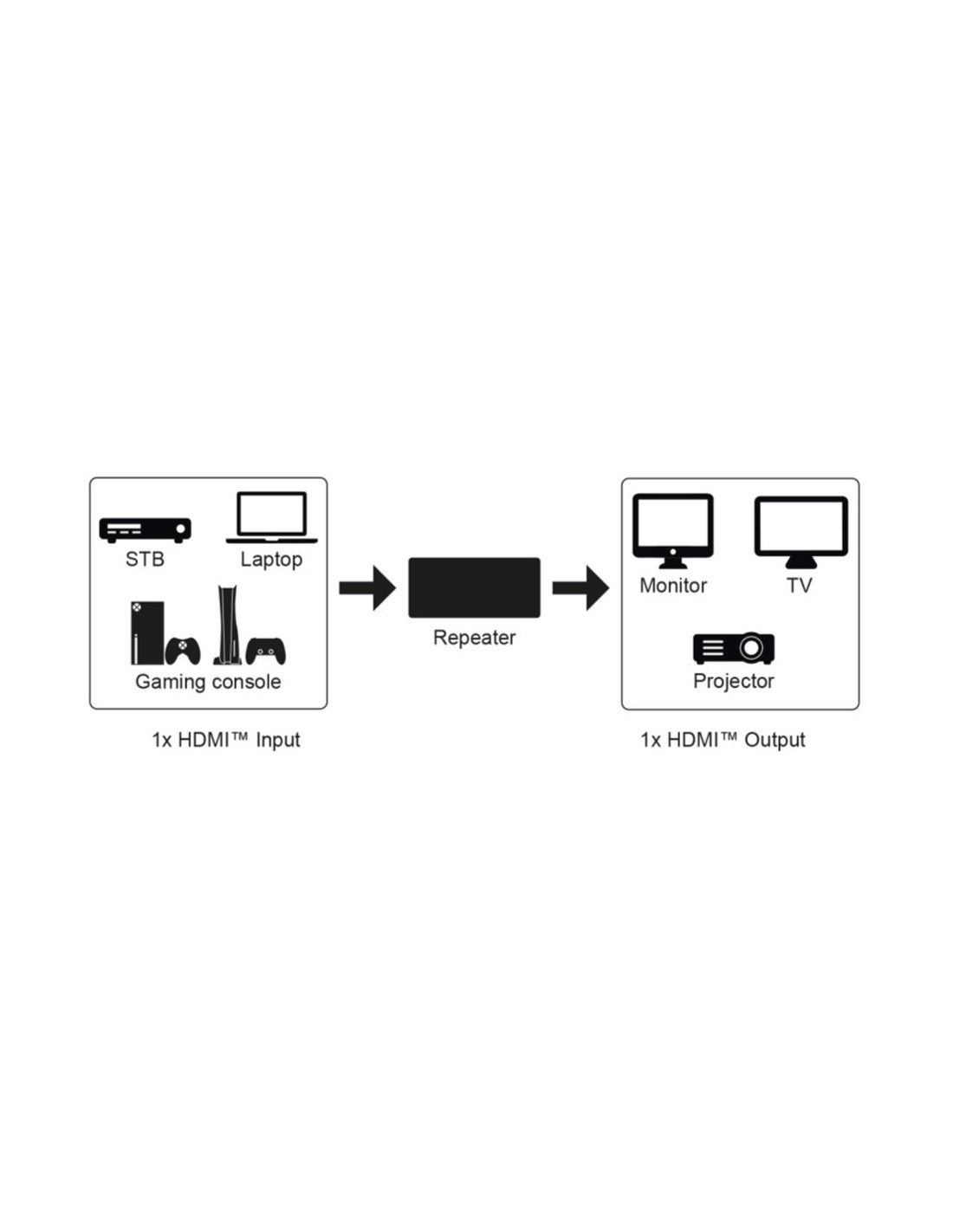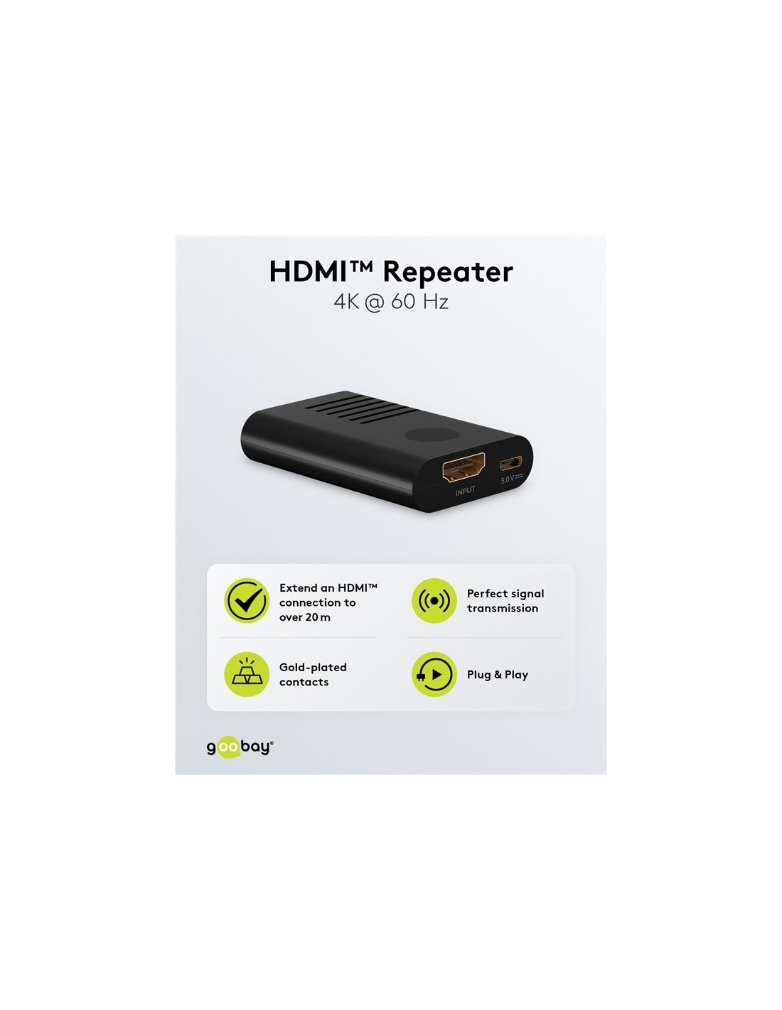 - El repetidor HDMI™ amplifica el nivel de señales HDMI™ débiles en 4K a 60 Hz a una distancia de hasta 20 m y en 4K a 30 Hz hasta más de 25 m.