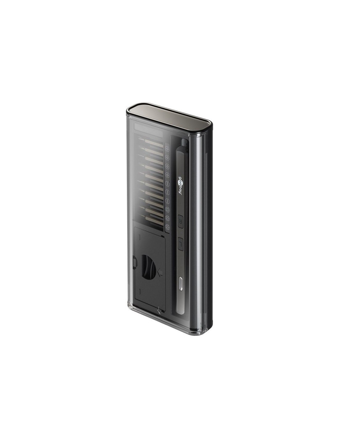 Práctico juego de destornillador fabricado en aluminio recubierto, en un estuche delgado con tapa transparente.