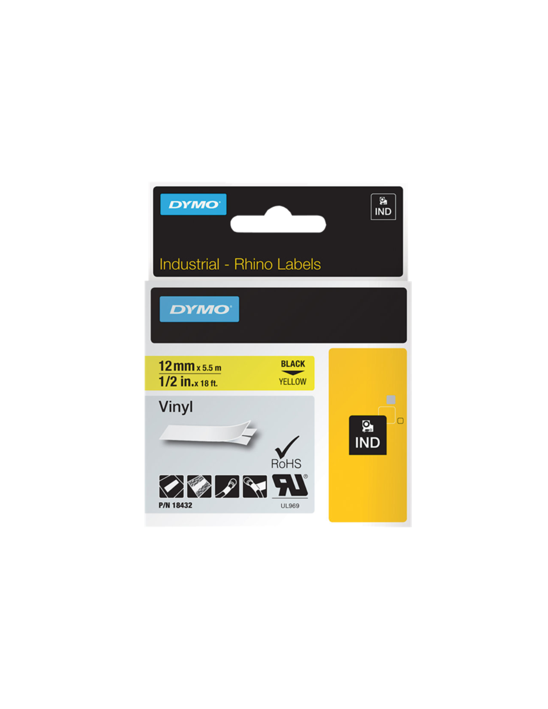 Cinta mecanográfico Negro sobre amarillo Cinta de vinilo, Rhino, IND, 12mm x 5,5m, negro sobre amarillo