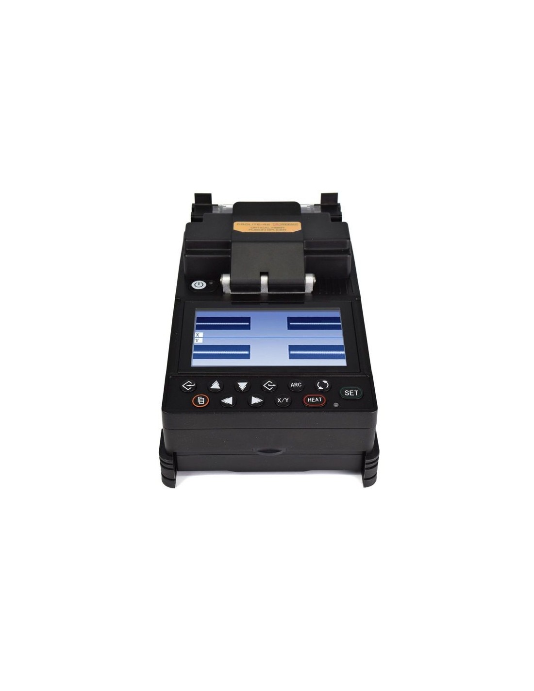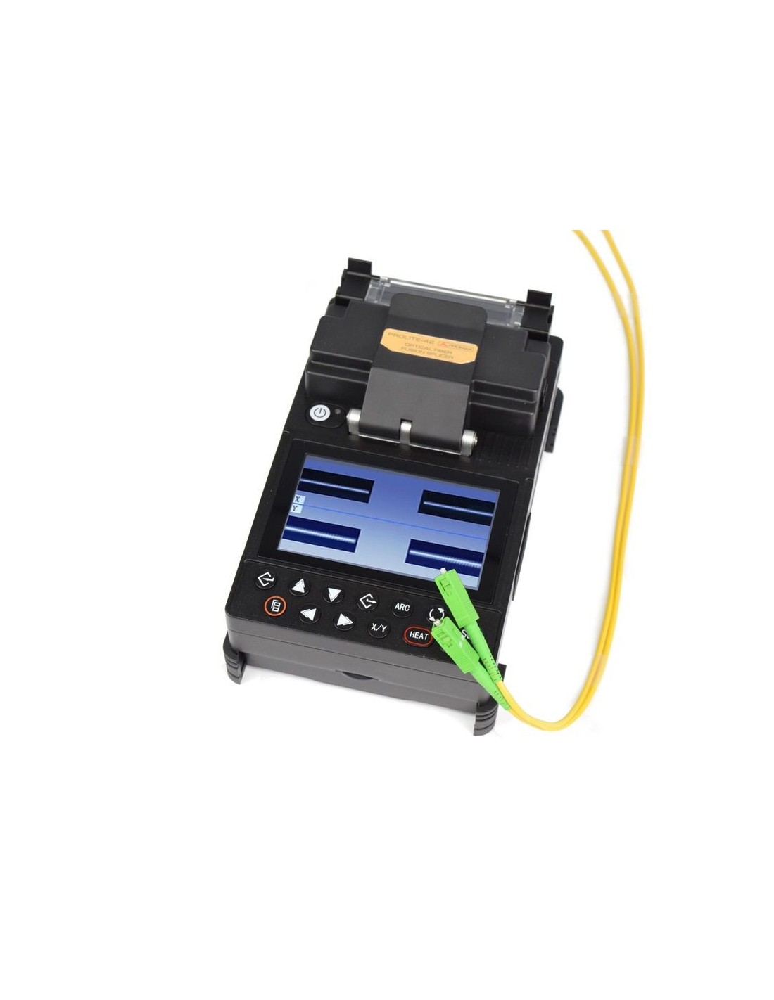 Fusionadora de fibra óptica extra plana con cortadora, peladora y accesorios. Batería extraíble, con autonomía de 300 fusiones.