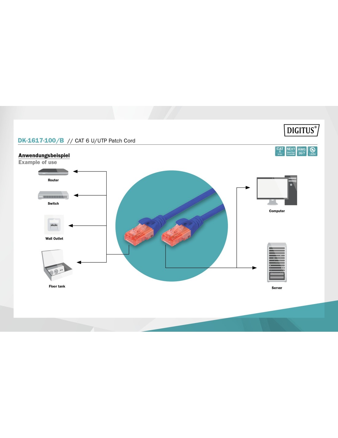 Los cables de conexión DIGITUS® categoría 6 clase E se fabrican y verifican conforme a las normas ISO/IEC 11801 y DIN EN 50173 CAT 6. Garantizan que la instalación de del cable cumple las especificaciones de la ISO & EN Channel y ofrecen un rendimiento sobresaliente en el cableado DIGITUS® CAT 6. Se ha verificado el rendimiento hasta 250 MHz, incluidas características como por ejemplo la paradifonía (“NEXT”). Los cables de conexión DIGITUS® han sido específicamente desarrollados para cumplir totalmente todos los requisitos en todos los sectores de utilización. Todos los cables están equipados con una envoltura de protección anti dobleces inyectada con descarga de presión. La envoltura dispone además de una protección de pestaña de retención que evita que se enganche el cable y que se rompa la pestaña de retención del conector. La categoría 6 se puede identificar fácilmente gracias al color rojo del conector.
