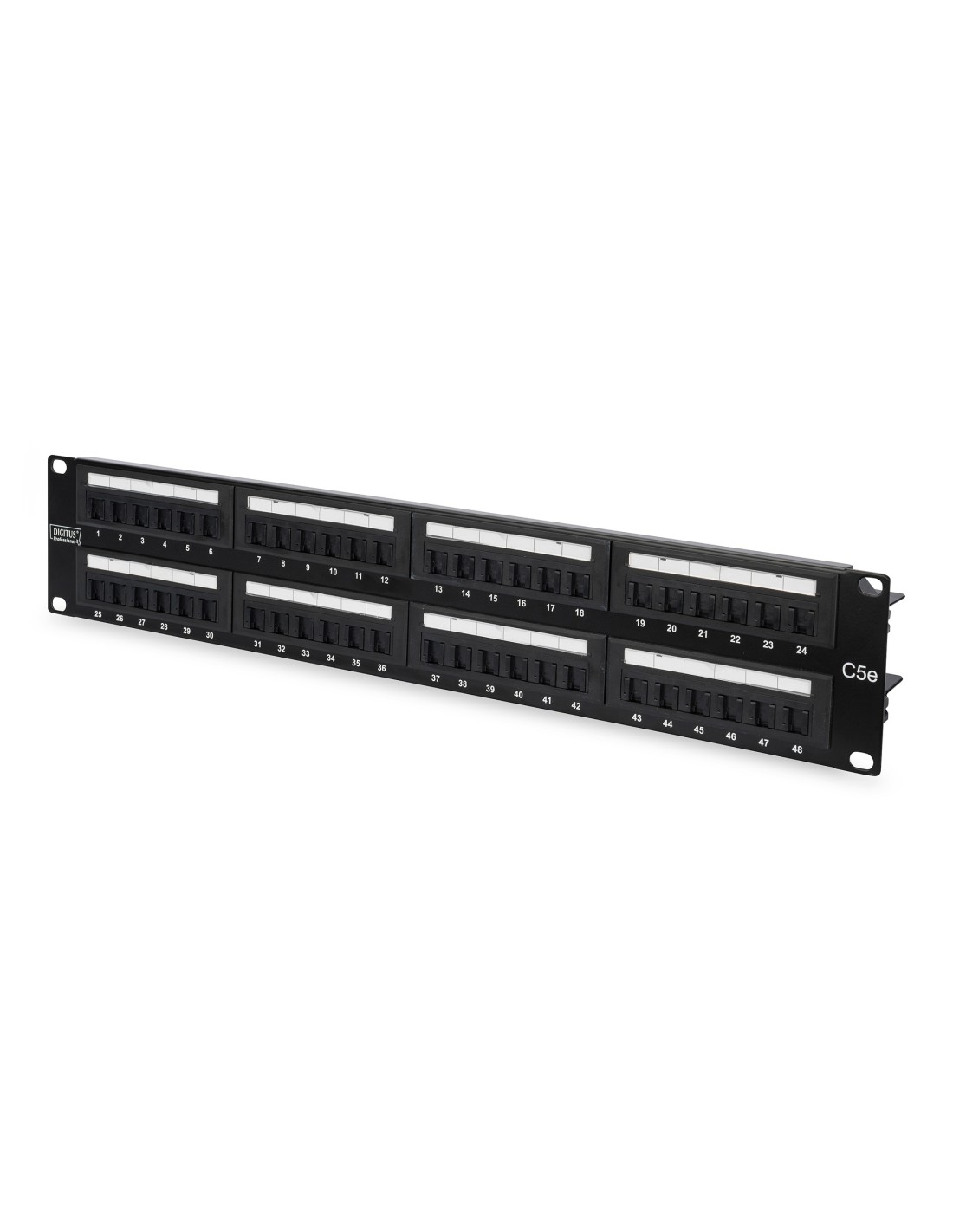 El panel de conexión CAT 5e sin apantallar de DIGITUS® está disponible con 16 o 24 puertos (1 unidad rack) o 48 puertos (2 unidades rack). La carcasa está hecha de acero laminado galvanizado en frío de 1,5 mm y por lo tanto es perfectamente adecuado para montaje en rack de 19".