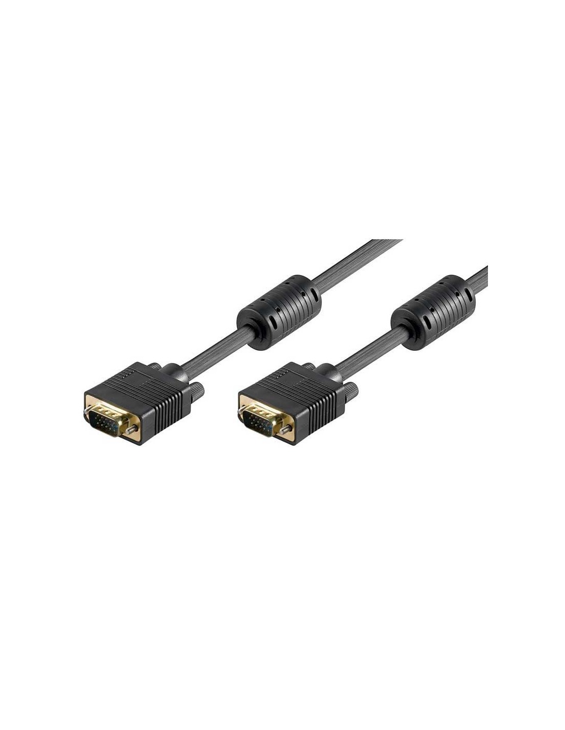 Cable VGA Doble Apantallado con conectores HD15 Macho en ambos extremos. El doble apantallado de este tipo de cable evita la pérdida de señal cuando la distancia entre el PC y el monitor es larga (hasta 30 m.) y garantiza la perfecta transmisión de la señal en entornos con aparatos eléctricos que pudieran provocar interferencias. Cumple con la normativa UL2919. El cable está apantallado en su totalidad y además añade un triple apantallado coaxial especial en cada uno de los 3 hilos básicos de RGB. Además de los 3 pins de RGB dispone de 4 cables más conectados, siendo el pin-out: 1-1, 2-2, 3-3, 5-5, 6-6, 7-7, 8-8, 13-13, 14-14 y 15-15.