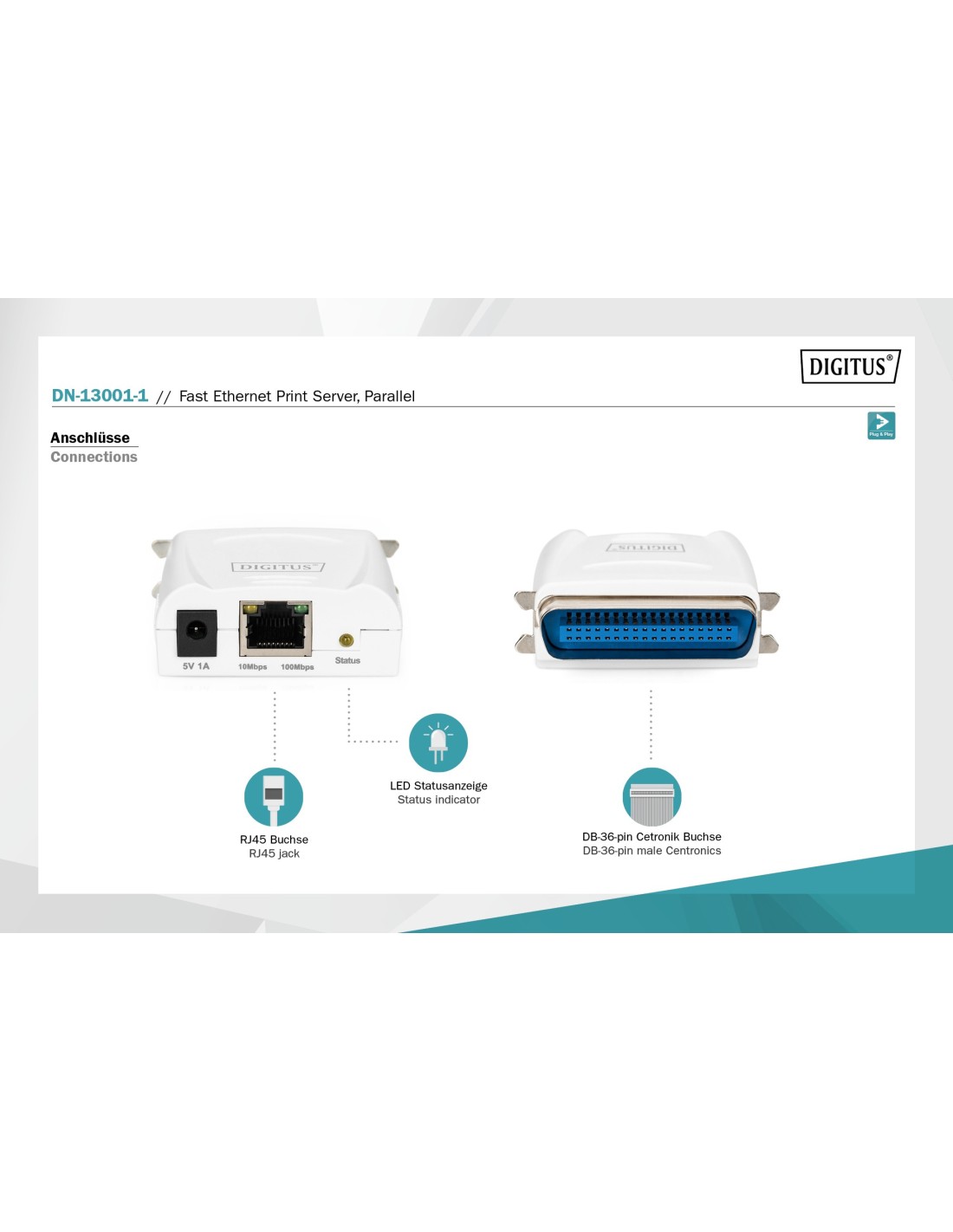 14 días de devoluciónServidor de impresión paralelo, 1 puerto 1x RJ45, 1x DB-36-pin macho Centronics