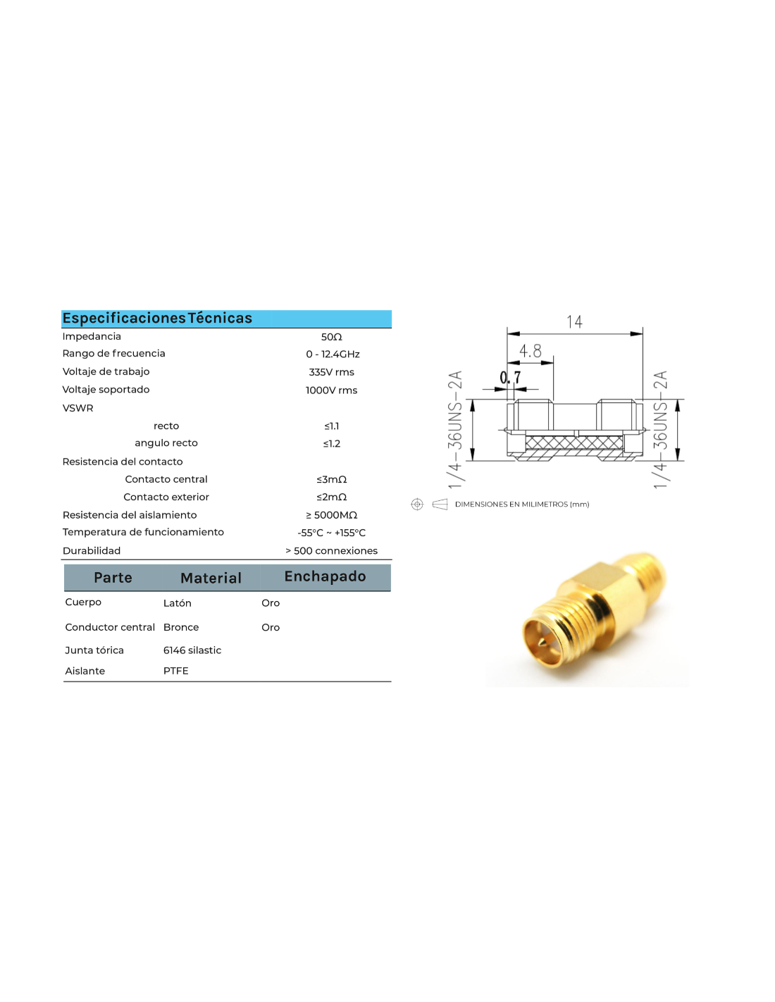 Adaptador basado en conectores coaxiales SMA-Hembra-Invertido (rSMA-H), utilizados en los puntos de acceso y adaptadores wireless 802.11 para conexión con las antenas y su cableado. Adaptador SMA-Hembra-Invertido en ambos extremos.