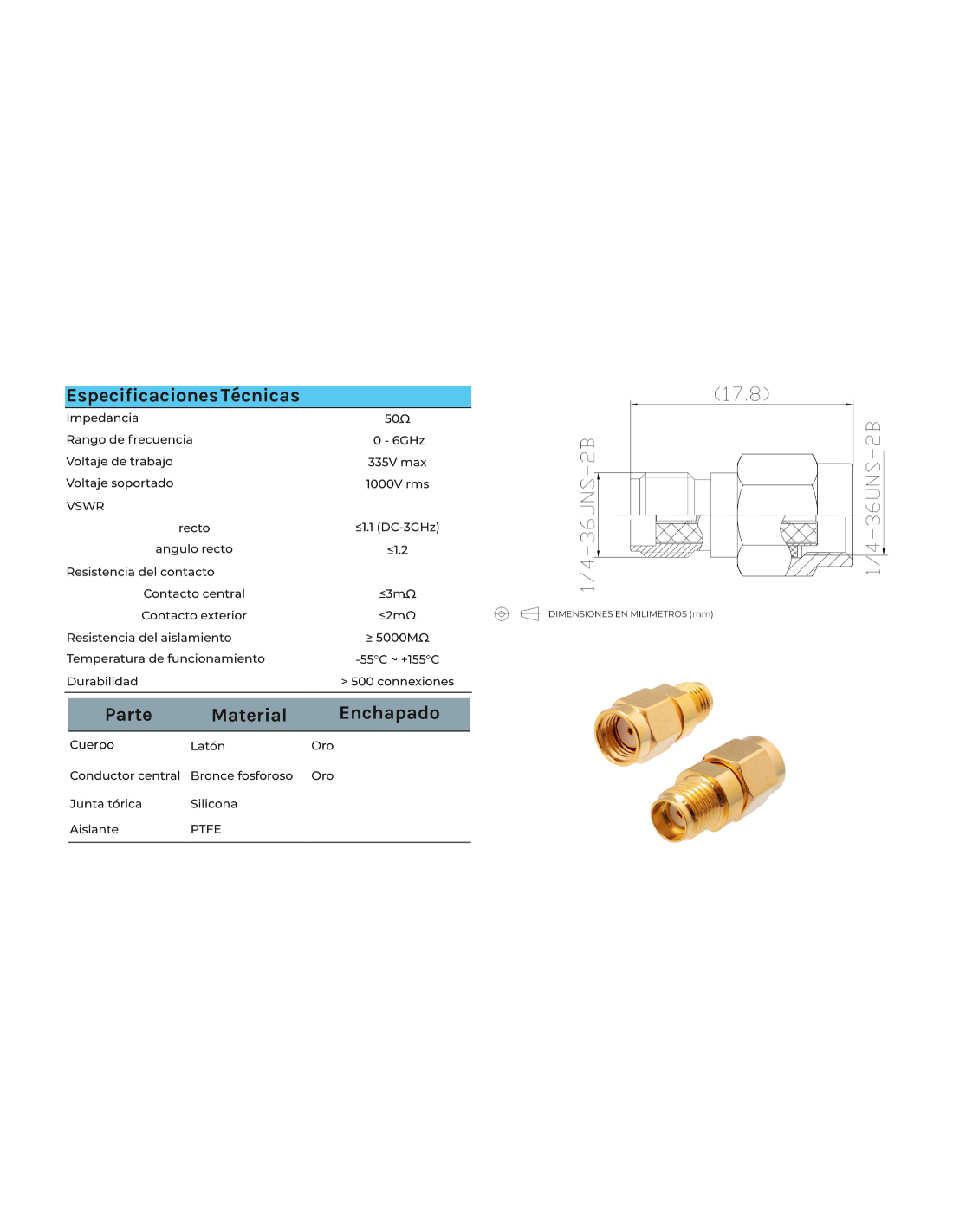 Adaptador basado en conectores coaxiales SMA, utilizados en los puntos de acceso y adaptadores wireless 802.11 para conexin con las antenas y su cableado. Adaptador SMA-Hembra en un extremo y SMA-Macho-Invertido en el otro