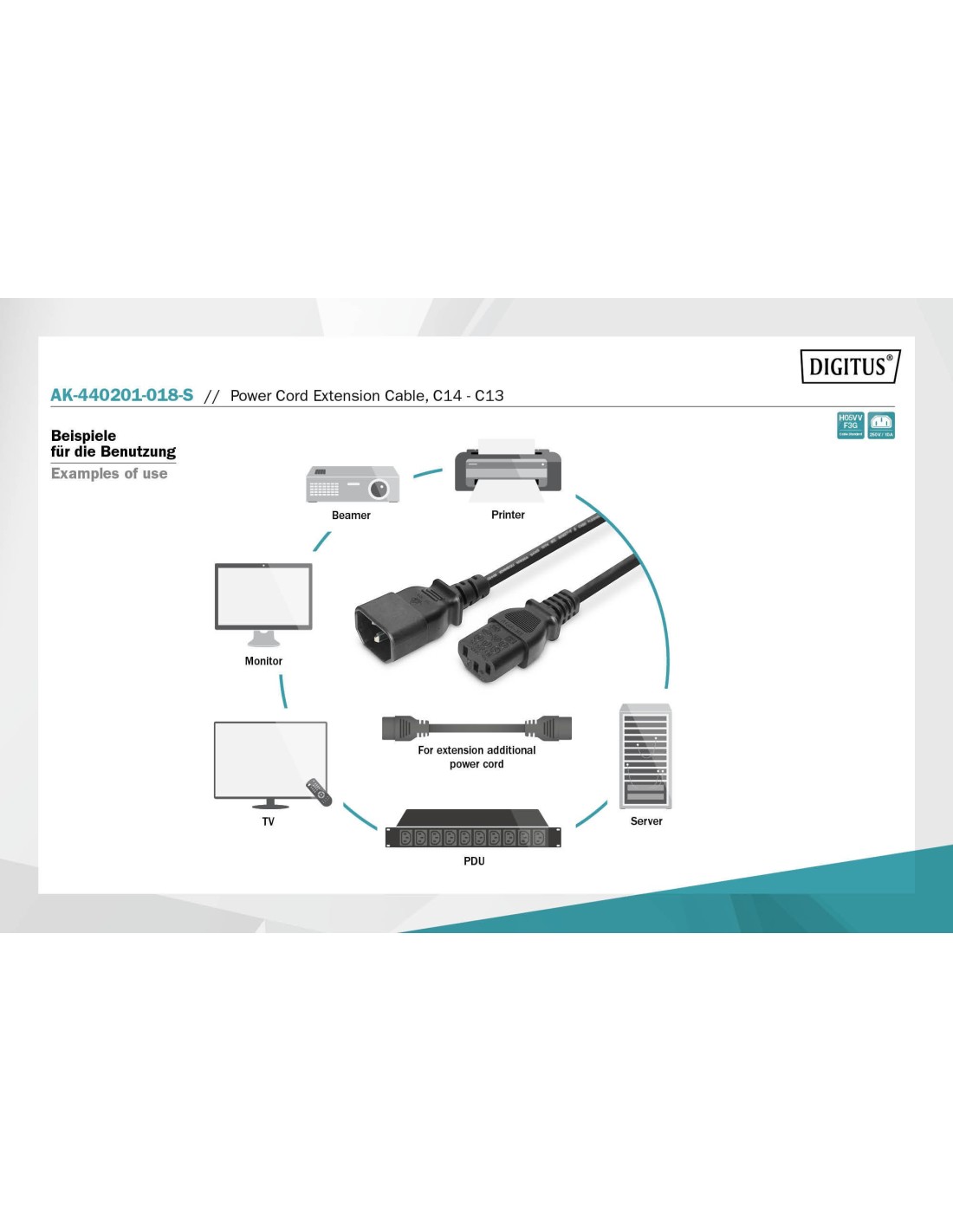 • Equipado en un extremo con conector hembra tripolar IEC-320 y en el otro con conector macho tripolar IEC-320.