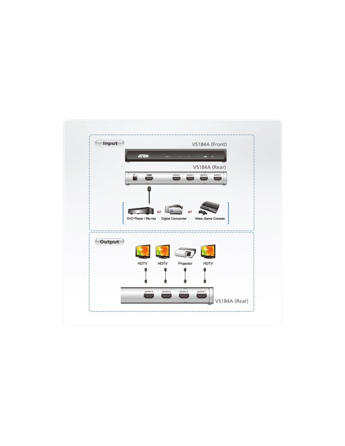 El repartidor HDMI VS184A representa la solución perfecta para todo aquel que desee mostrar la señal de una fuente de vídeo digital de alta definición en cuatro pantallas HDMI simultáneamente. Es compatible con cualquier equipo preparado para HDMI, tales como reproductores de DVD, descodificadores para televisión satélite y todo tipo de pantallas HDMI.