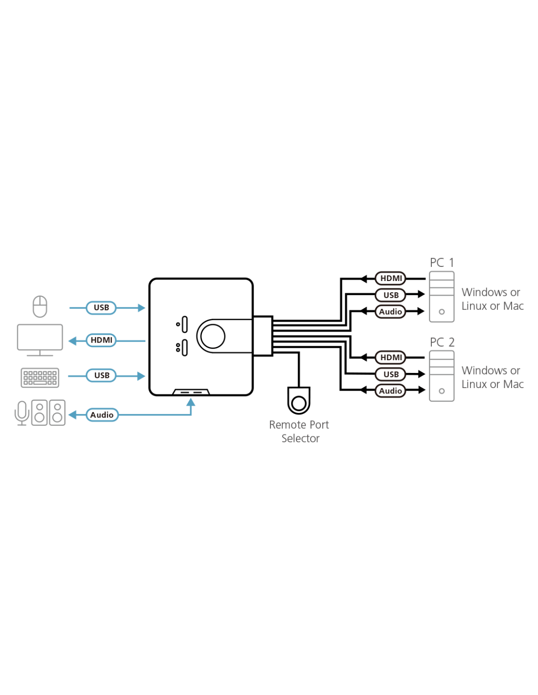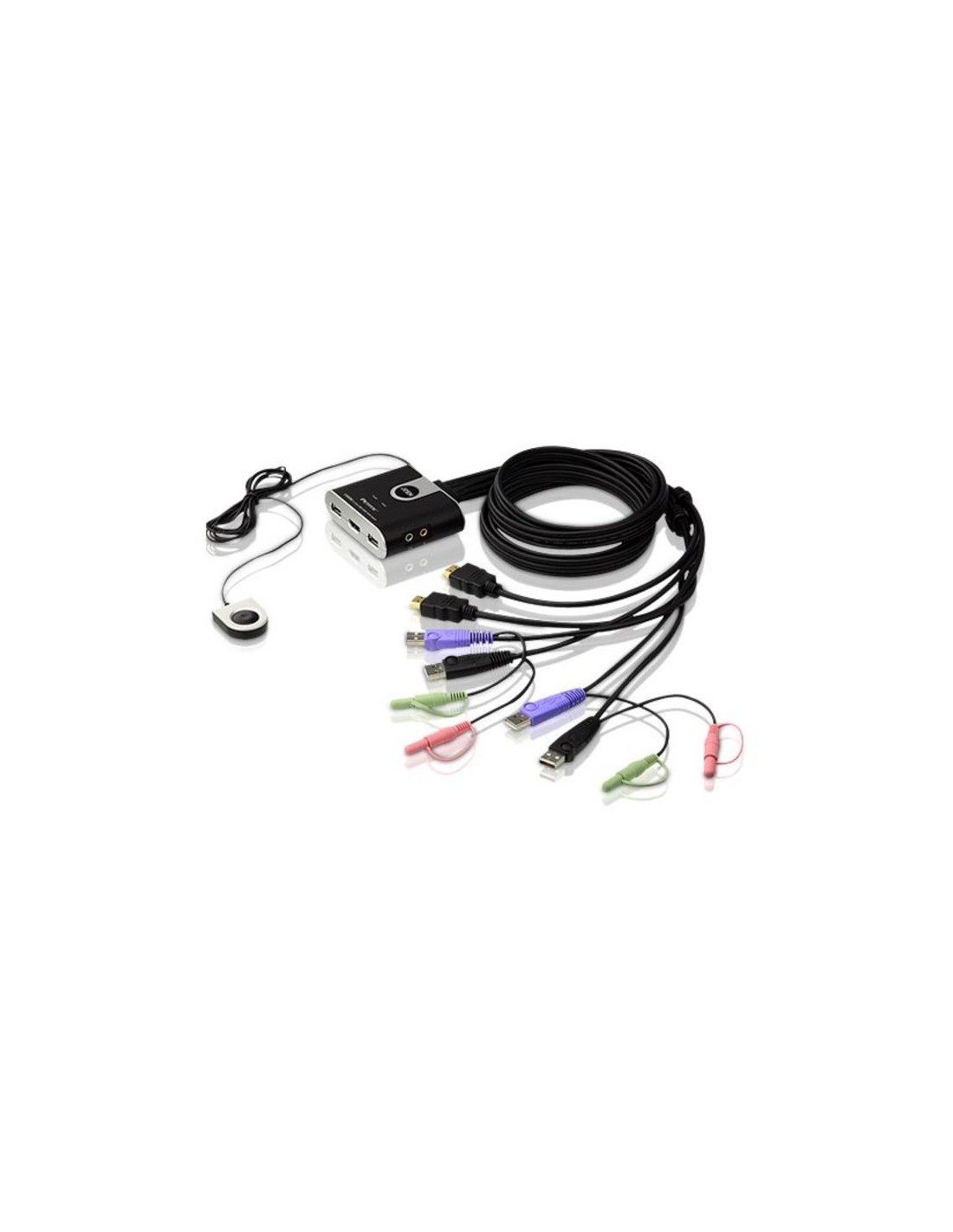| Puertos KVM | 2 x HDMI macho (Negro) 2 x USB Tipo A macho (Púrpura) 2 x USB Tipo A macho (Negro) 2 x Conector de audio de 3,5 mm macho (Verde) 2 x Conector de audio de 3,5 mm macho (Rosa) |