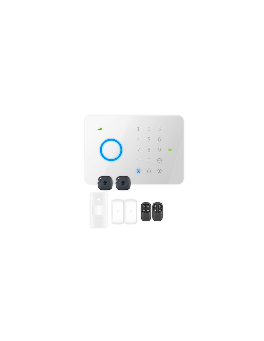 Este magnífico kit cuenta con todo lo necesario para que usted mismo pueda instalarse una alarma que le avisará a su teléfono móvil ante cualquier intento de robo o intrusión. Está formado por el panel de control, un sensor de movimiento PIR, dos detectores de apertura de puerta/ventana, dos mandos a distancia y dos tarjetas de proximidad RFID.