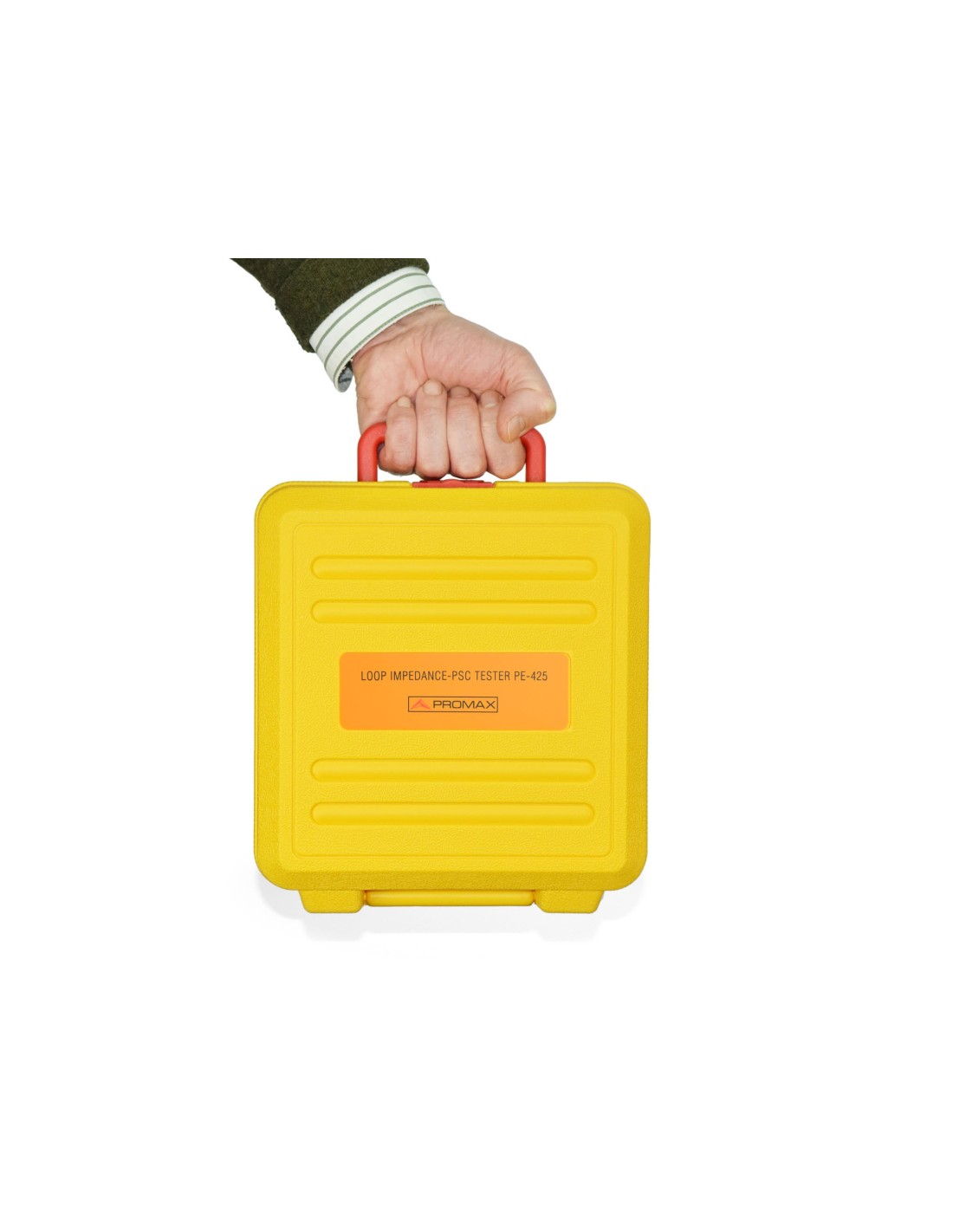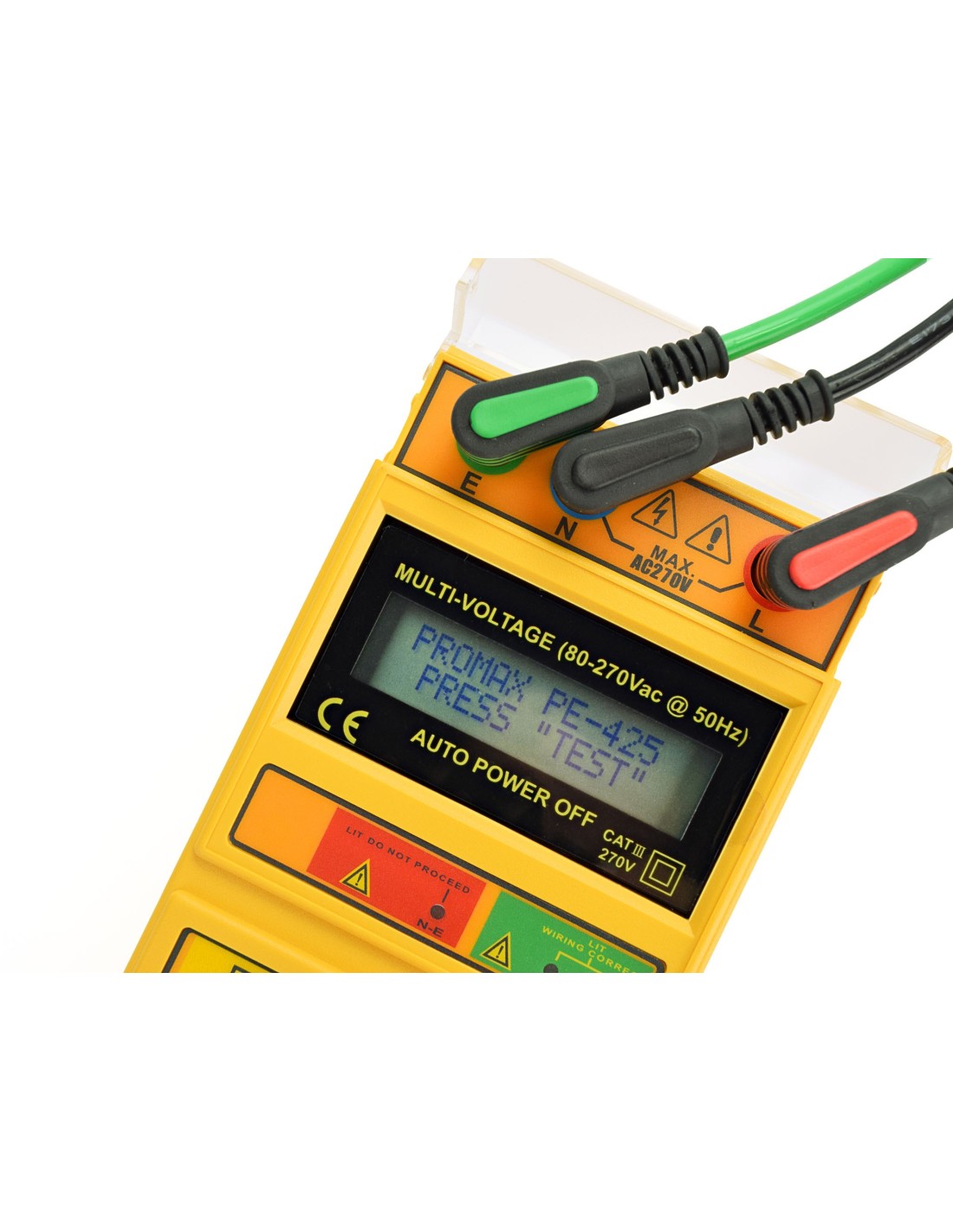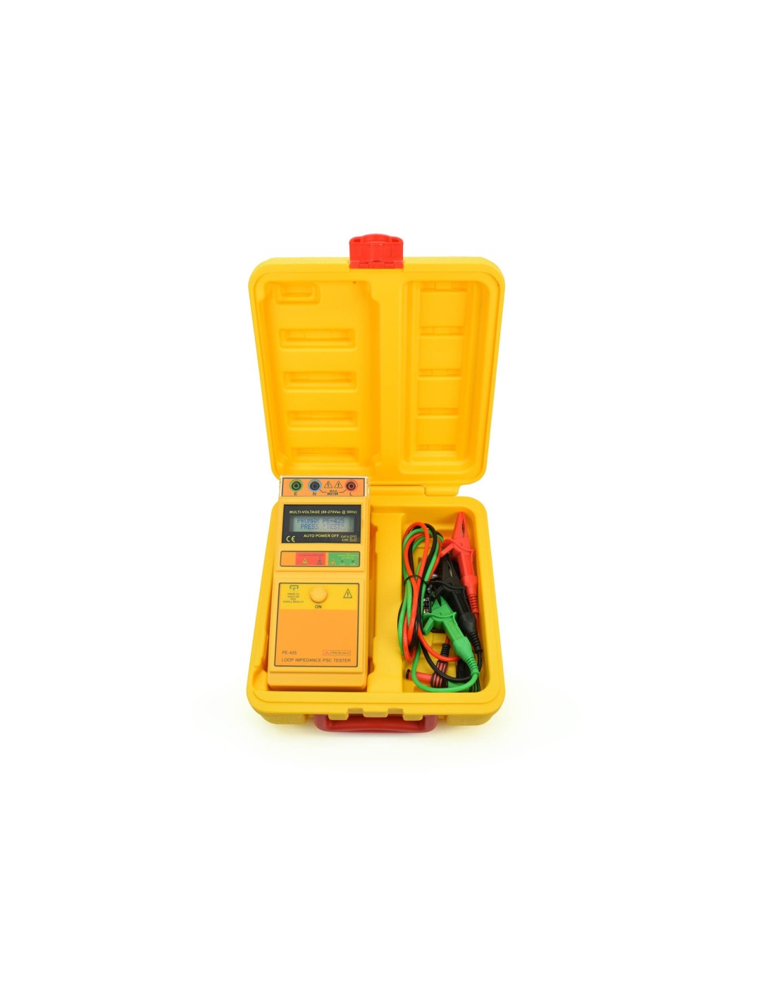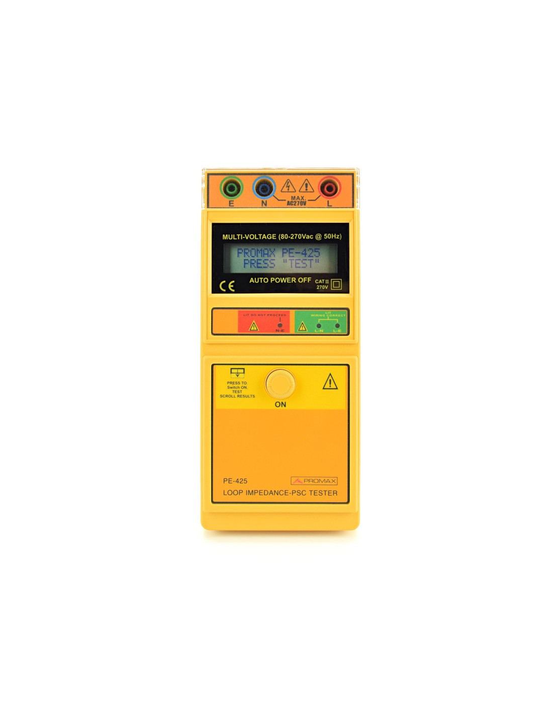 El Medidor de tierra sin picas PE-425 efectúa la medida de la impedancia de bucle y de PCC (Probable Corriente de Cortocircuito) en escalas desde 0,3 a 2000 Ohmios. Es posible visualizar la PCC de Línea a Neutro de de Línea a Tierra. Así mismo, el PE-425 integra un voltímetro.