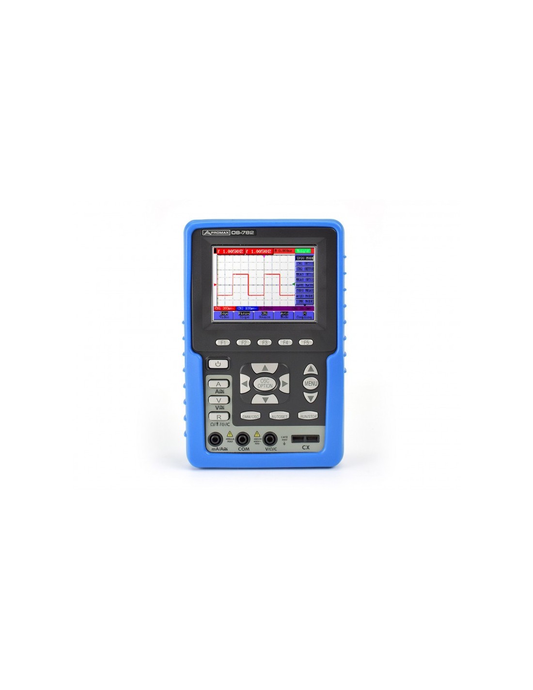 El poliscopio OS-782 de PROMAX integra en sí mismo dos instrumentos de medida: Osciloscopio digital de doble canal (20 MHz, 100 MS/s) y Multímetro digital. Las medidas realizadas por el equipo se presentan en una pantalla de cristal líquido de alta resolución con iluminación posterior.