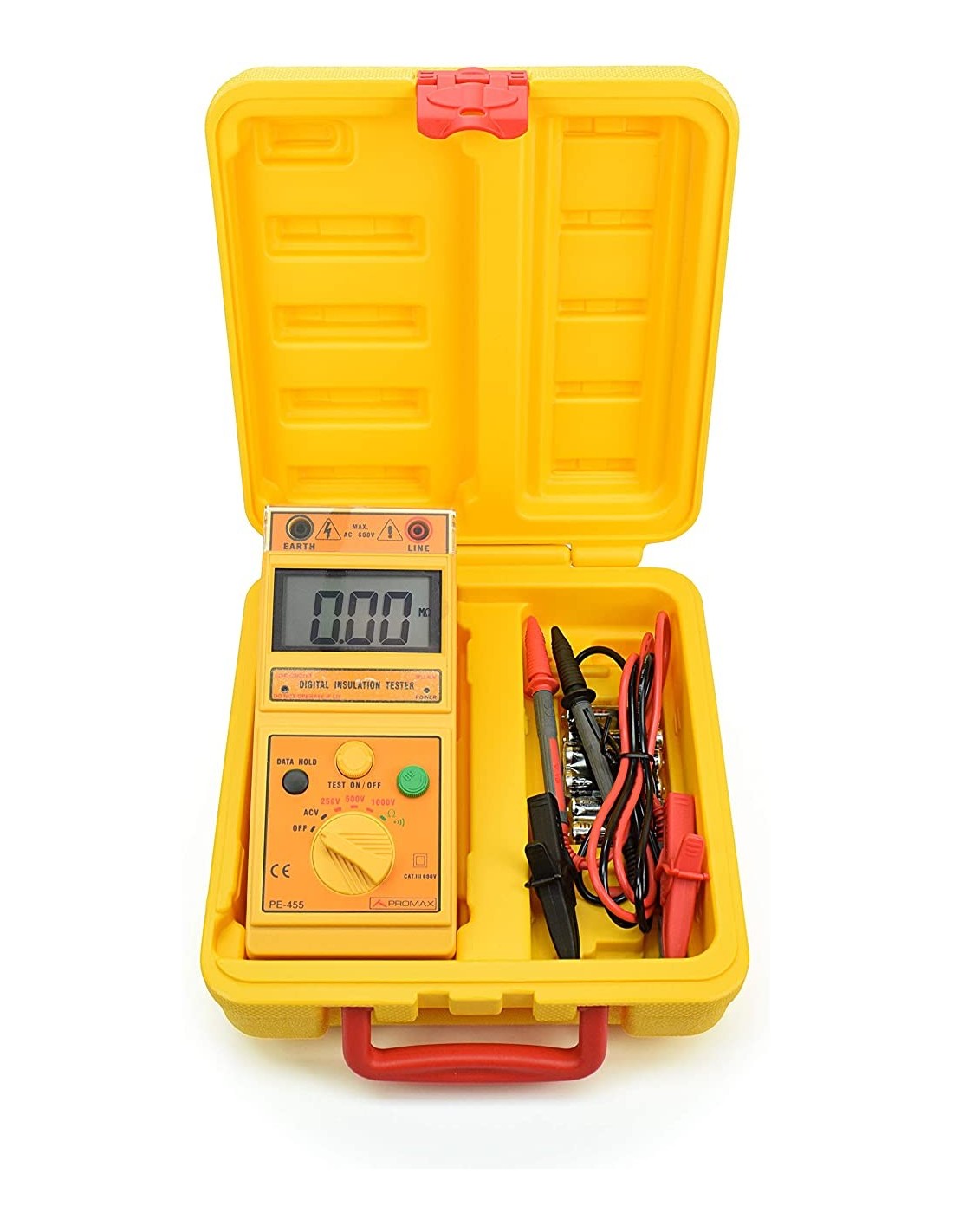 El Medidor de aislamiento PE-455 lleva a cabo la prueba de aislamiento a tensión constante con una corriente de carga de 1 mA, con diferentes escalas para resistencia y resistencia de aislamiento.