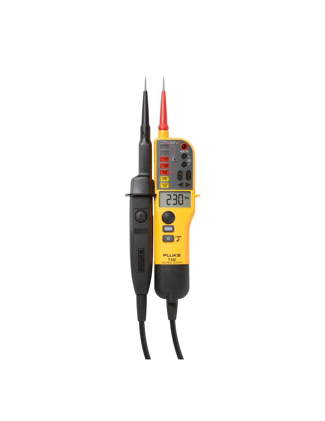 - Cuatro formas distintas de detectar la tensión CA/CC: un indicador LED nítido y visible al instante, una representación digital del valor medido, una prueba de continuidad audible y un sistema de vibración que proporciona una respuesta táctil
